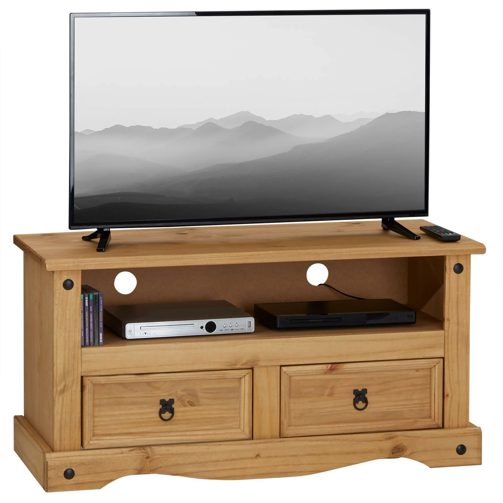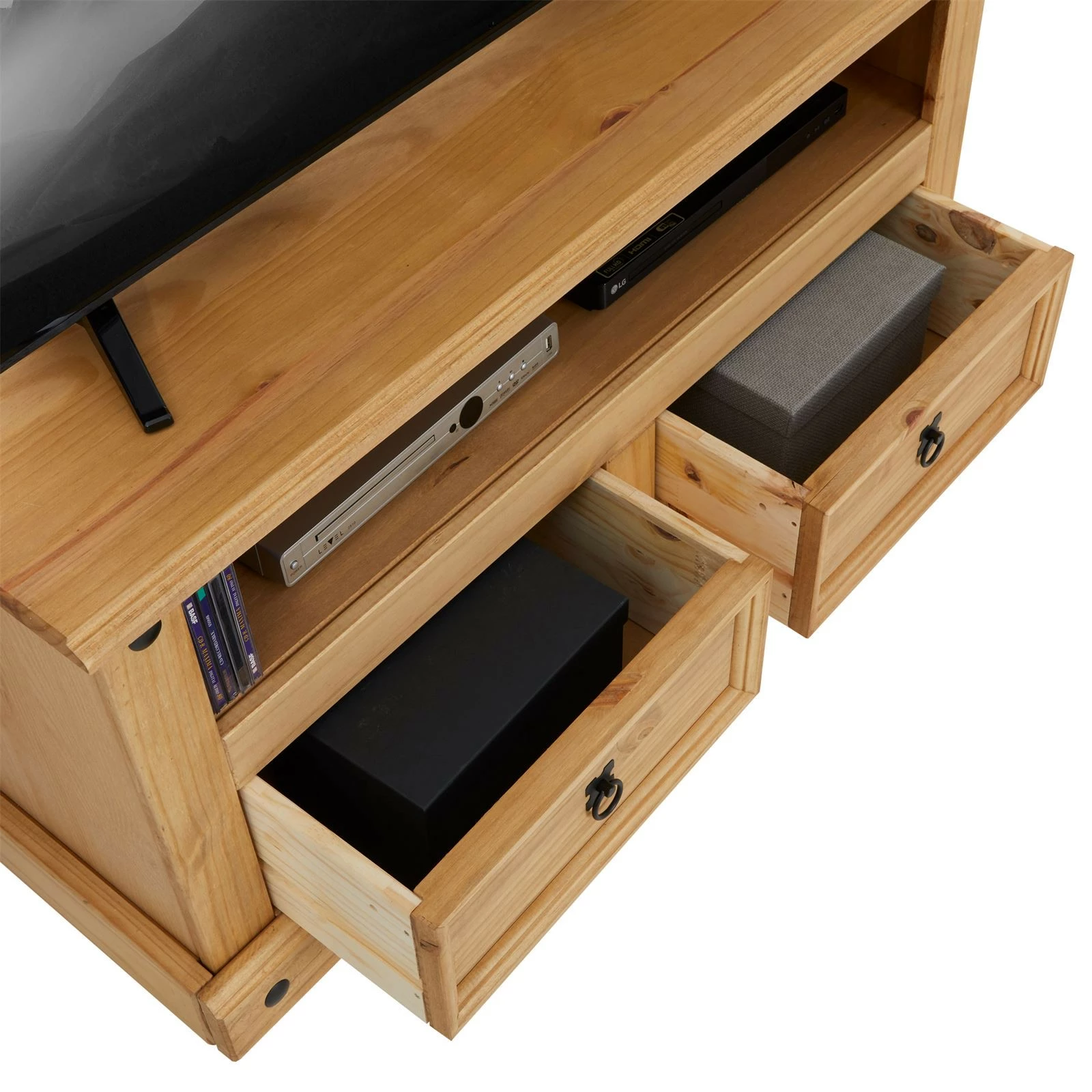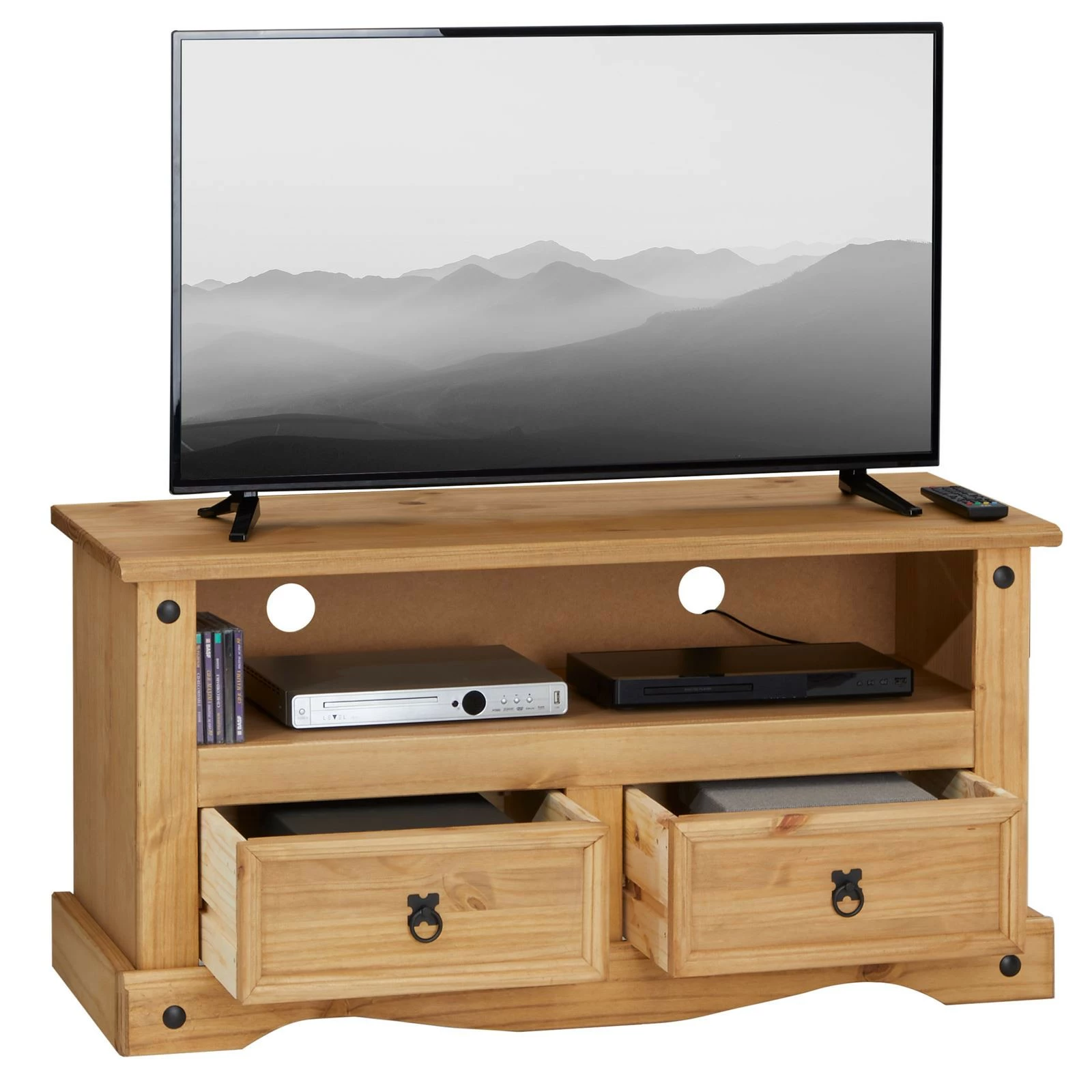 Zusätzlichen Stauraum bieten 2 Schubladen im unteren Bereich. Der dekorative TV Tisch im Landhausstil ist aus hochwertigem Kieferholz gefertigt, auf dem der Fernseher optimal genutzt werden kann.