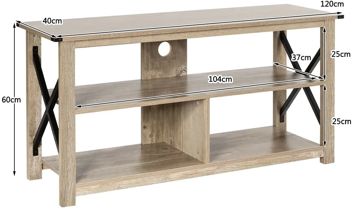 Schauen Sie sich Ihren Lieblingsfilm oder Ihre Lieblingsserie in einer hübschen Umgebung an! Diese rustikale TV-Kommode mit Kabelführungsloch ist ideal für Ihr Zuhause. Ihre geräumige Oberfläche bietet Platz für Fernseher mit einer Größe von bis zu 140 cm. Zudem hat sie eine hohe Tragkraft. Dank des Kabelführungslochs ist die Ordnung zudem gewährleistet. Durch das offene Regal steht Ihnen viel Platz für Dekoration und andere Gegenstände zur Verfügung. Die dicken Holzplatten sind formstabil und garantieren die Robustheit des Möbelstücks. Das rustikale Design versprüht einen einzigartigen Flair im Wohnzimmer oder Schlafzimmer. Zögern Sie also nicht länger und schlagen Sie zu!