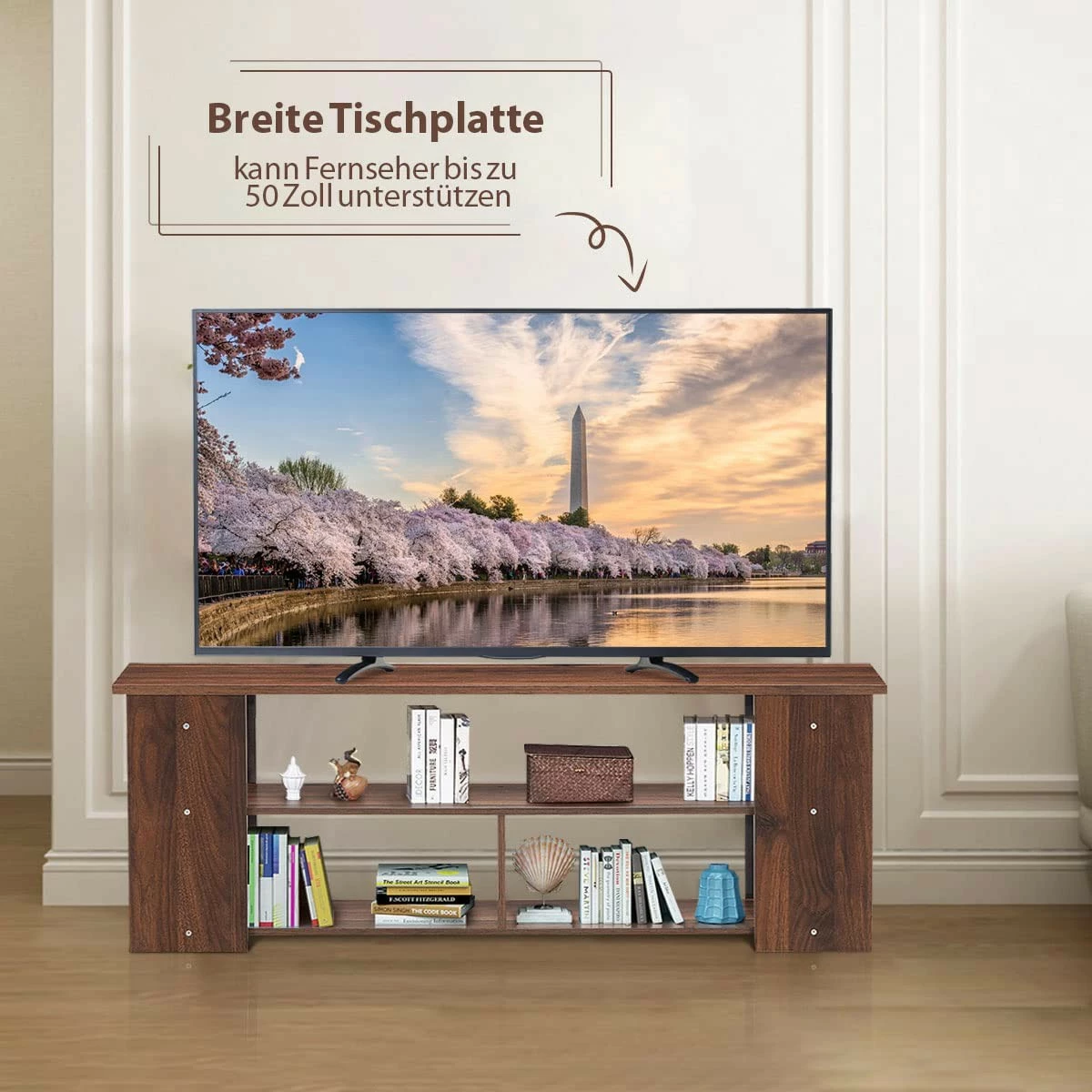 Bringen Sie mit dieser TV-Aufbewahrungskonsole aus Holz klassischen Stil und alltägliche Funktionalität in Ihre geliebten Wohnräume! Dieser freistehende TV-Ständer macht eine separate TV-Wandhalterung überflüssig und ist die perfekte Kombination für jeden Flachbildfernseher bis zu 43 Zoll. Der stabile und langlebige Spanplattenrahmen hilft diesem Konsolentisch, sich von den anderen abzuheben. Drei offene Regale und Die große Oberfläche bieten viel Stauraum, Sie können mit diesem großartigen Möbelstück einfach und ordentlich wichtige Medien und Dinge des täglichen Bedarfs organisieren. Sie können alles aufbewahren, von Spielkonsolen und Stereoanlagen bis hin zu DVDs, Spielen, Büchern und Zeitschriften. Diese moderne Darstellung von Mid-Century-Möbeln ist perfekt für jeden Raum, der etwas Retro-Flair benötigt, und seine glatte Oberfläche macht es einfach, sie mit einem feuchten Tuch zu reinigen und zu pflegen. Fügen Sie ihr Ihrem Warenkorb hinzu und genießen Sie das bequeme Leben!