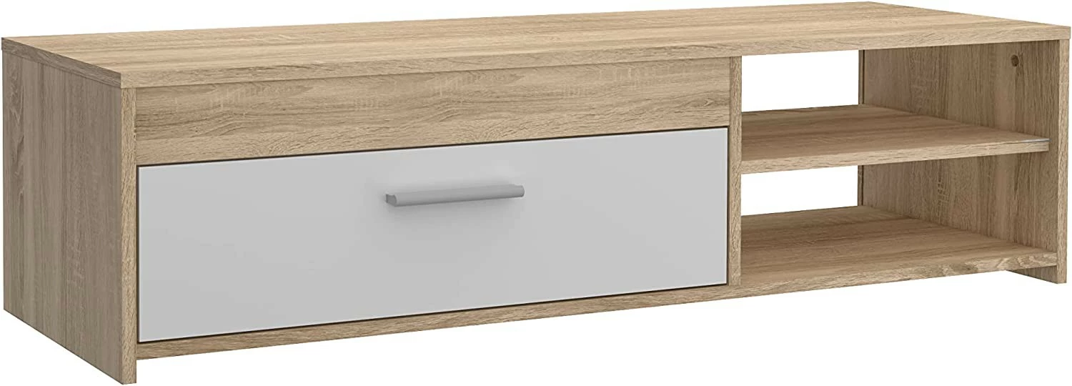 Dieser TV-Schrank mit hübscher Holzmaserung und weißer Tür ist eine tolle Ergänzung für Ihr Zuhause und wertet die Einrichtung optisch auf. Seine geräumige Oberseite bietet Platz für Fernseher bis zu 47″“, während im Schrank und Regal Dekoration, Videospielausrüstung, Controller, Magazine und mehr verstaut werden können. Aus hochwertigem MDF gefertigt ist der Schrank stabil und langlebig. Seine Oberfläche kann leicht mit einem feuchten Tuch gereinigt werden. Zudem gelingt die Montage mit der detaillierten Anleitung schnell. Der TV-Schrank eignet sich nicht nur für Fernseher, sondern kann auch für andere Dinge in Wohnzimmern, Schlafzimmern, Fluren, etc. verwendet werden.