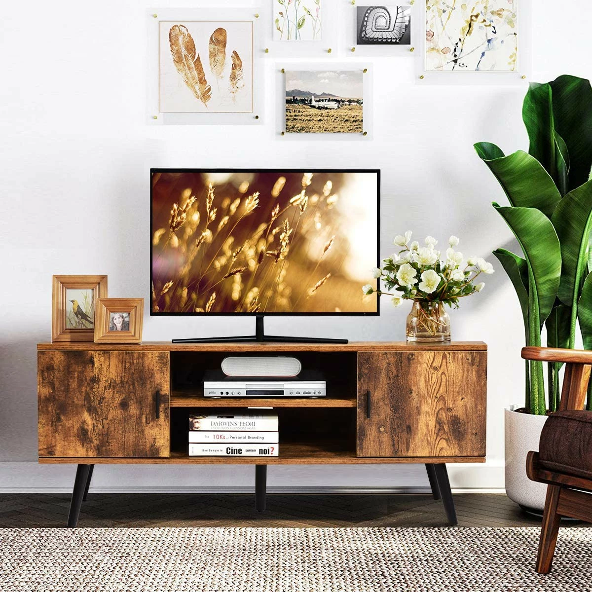 Mit Beinen aus solidem Kiefernholz und qualitativ hochwertigem Ingenieursholz ist dieser Fernsehtisch stabil und langlebig. Die große Tischplatte bietet Raum für die herkömmlichen Fernseher-Modelle. Entworfen mit 2 Regalreihen und Aufbewahrungsmöglichkeiten an den Seite, welche mit Türen ausgestattet sind, bietet er genügend Platz zum Verstauen von Kabelbox, DVD-Spieler, Filmen, Zeitschriften etc. Das moderne Design aus der Jahrhundertmitte springt sofort ins Auge und lässt sich einfach mit Ihren übrigen Objekten Zuhause kombinieren. Sein klassisches und elegantes Aussehen eignet sich perfekt für Wohnzimmer, Schlafzimmer und viele Weitere Räume.