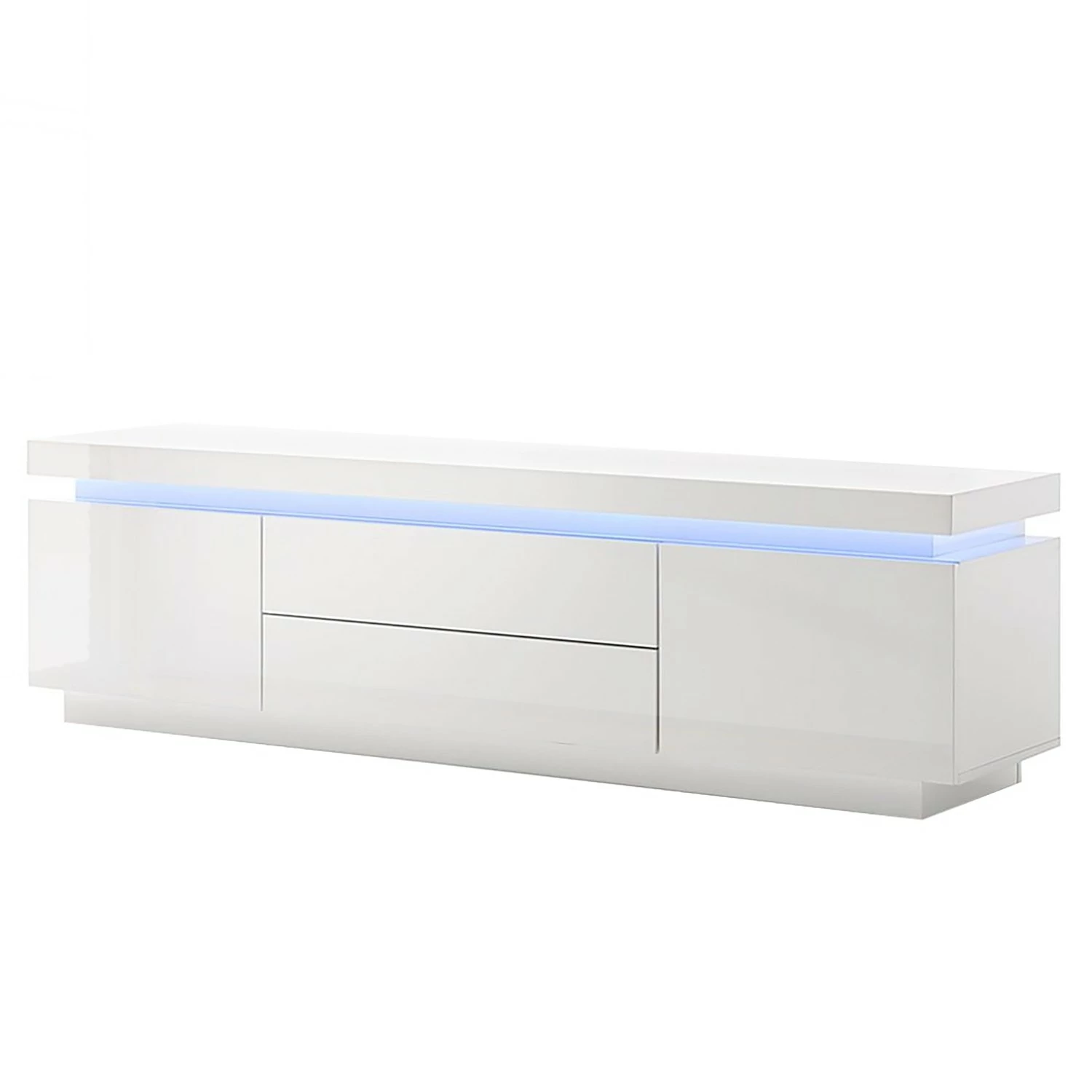 Modern und cool, so zeigt sich das TV-Lowboard Emblaze II. Klare Linien und ein cleaner Look geben dem Wohnbereich den ultimativen Coolness-Faktor. Die spiegelglatte Oberfläche des Mediamöbels glänzt und zieht sofort alle Blicke auf sich. Das Highlight dieses Lowboards ist jedoch die blaue LED-Beleuchtung. Ob bei Tag oder in der Nacht, das blaue Licht lässt die weiße Hochglanzoberfläche maximal leuchten. Mit einer Fernbedienung ist die Farbe des Lichts wechselbar, sodass immer wieder ein anderer futuristischer Eindruck entsteht.