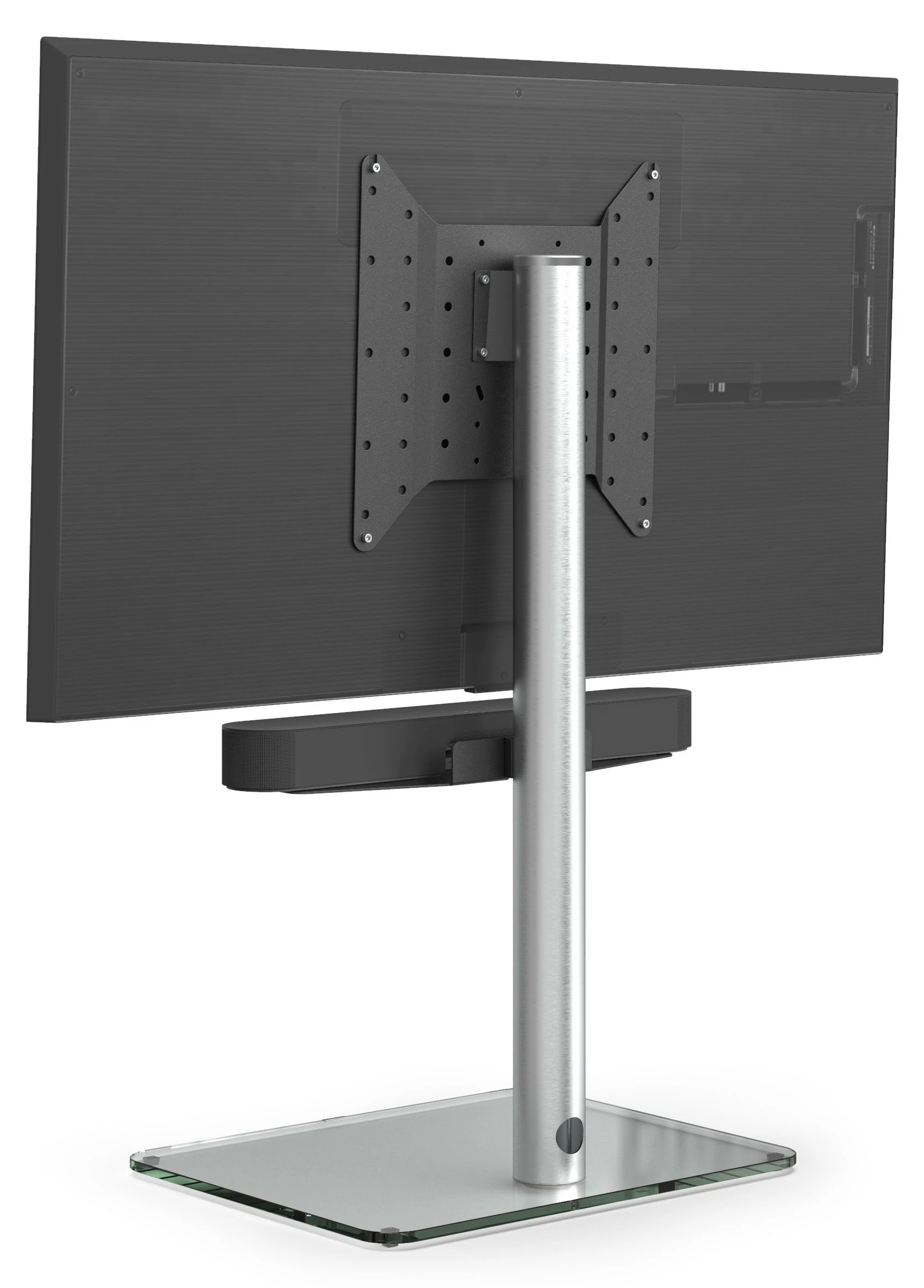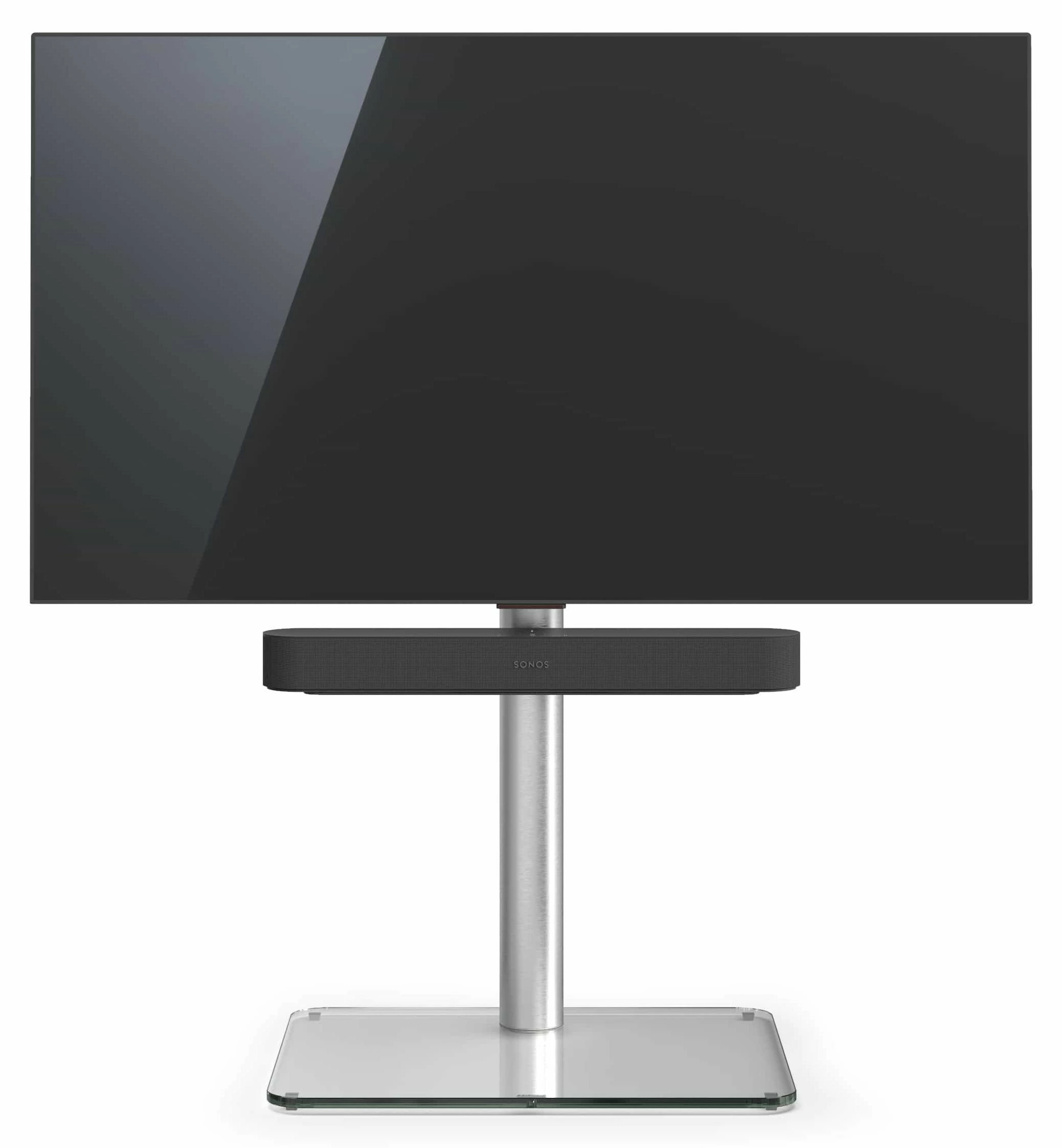 Zusammenspiel. Mit dem Just.Stand TV610SP gehen Soundbars mit flachen TV eine elegante Symbiose ein. Die Halterung für die Soundbar ist gleich mit dabei. Praktisch: Die zugehörige Verkabelung verschwindet unsichtbar in der hochwertigen, geschliffenen und versiegelten Aluminiumsäule.