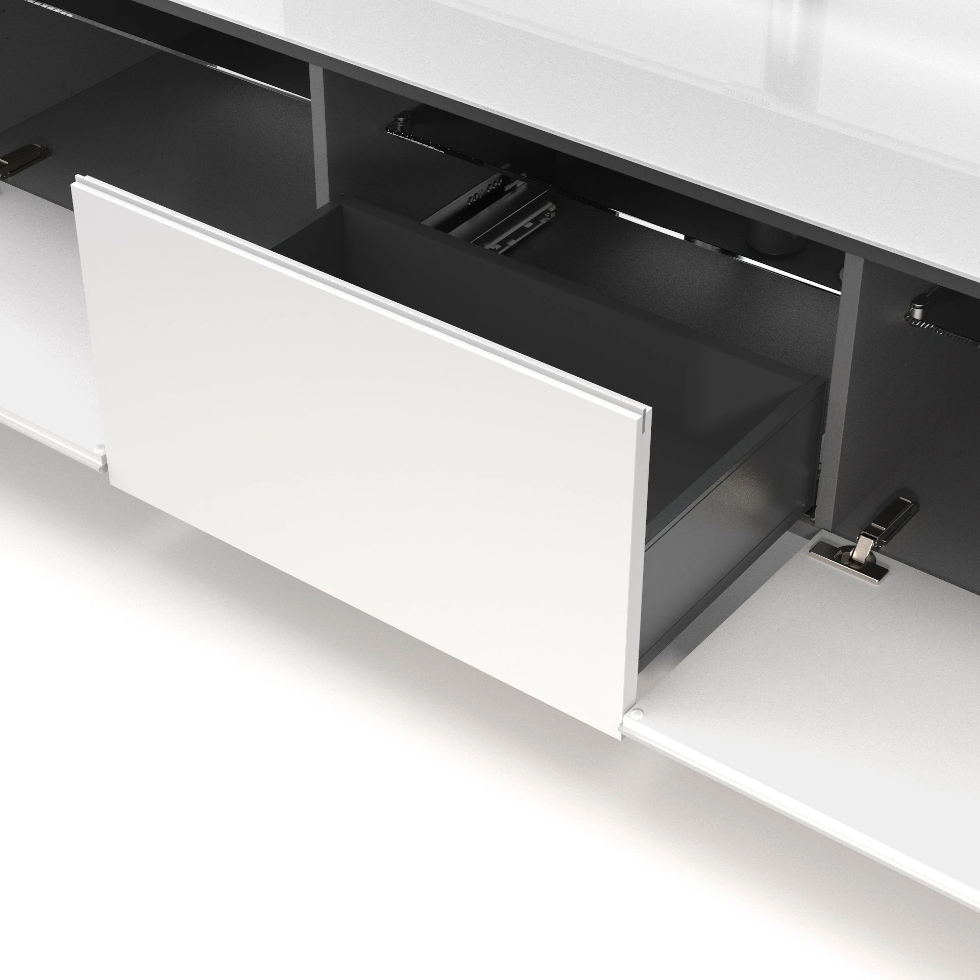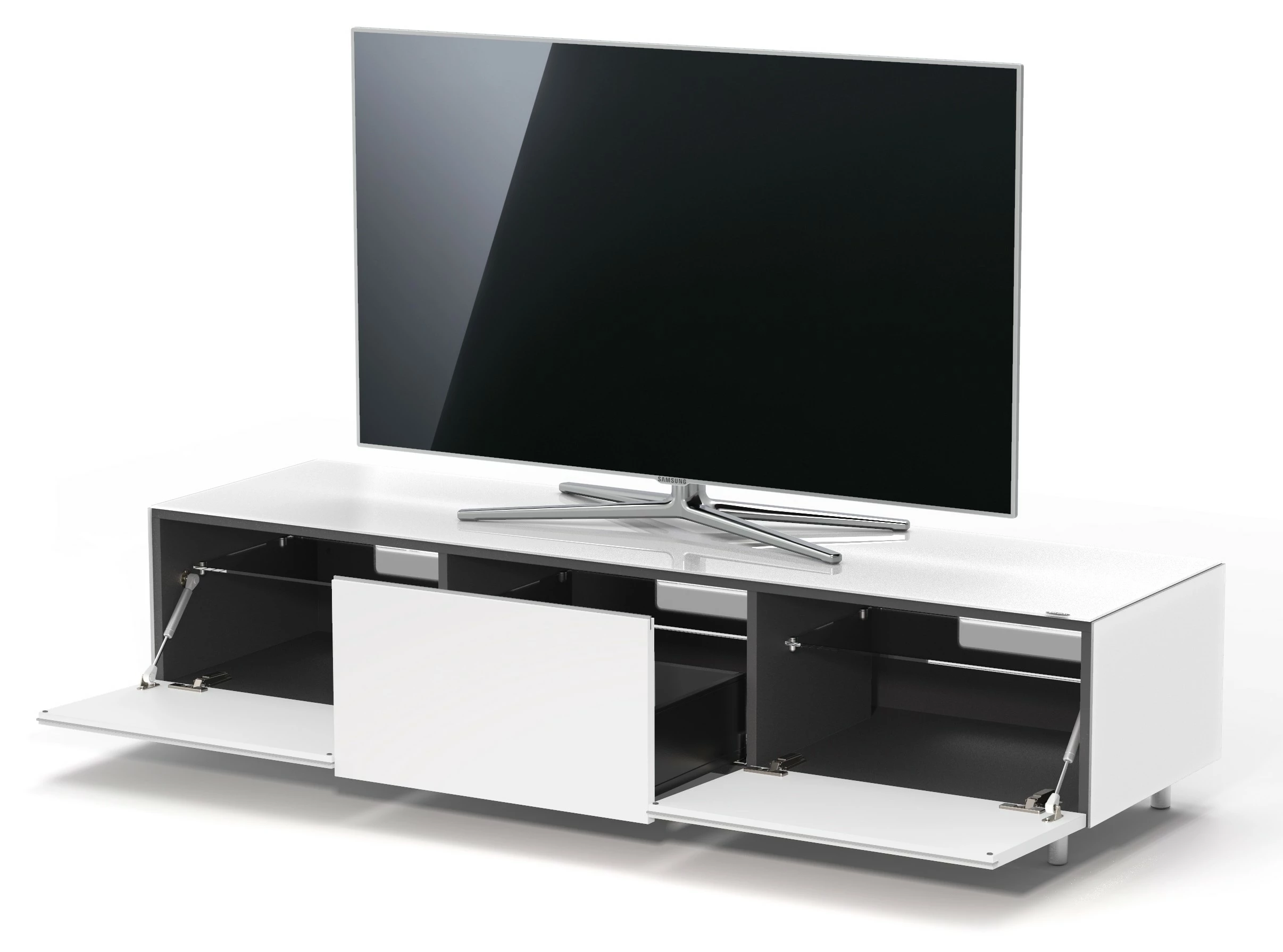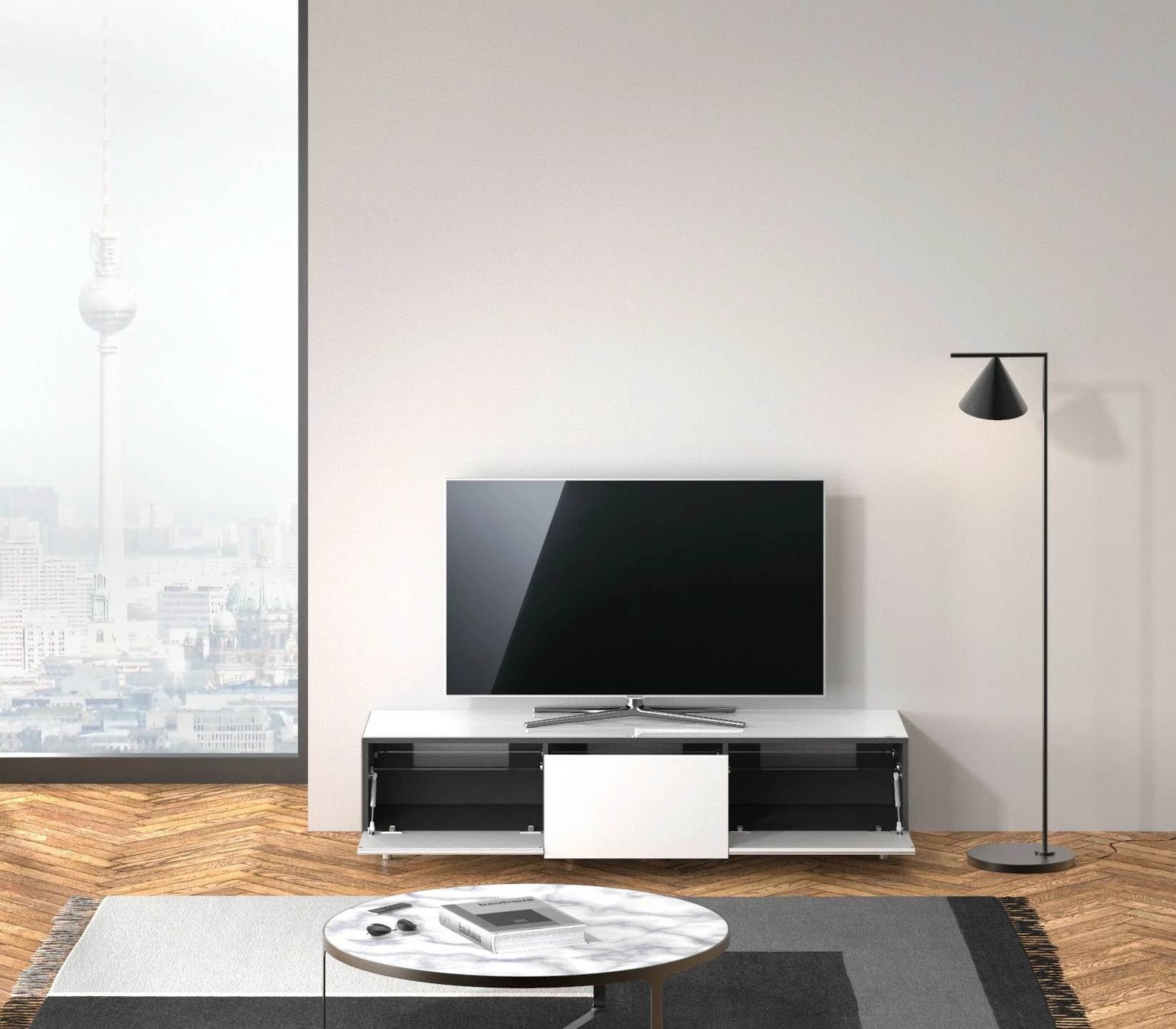 Ganz große Klappe. Die Klappe verfügt über eine elegante Griffleiste, so entstehen keine Fingerabdrücke auf den hochglänzenden Glasflächen. Hinter der breiten Klappe ist noch viel Platz für die komplette Verkabelung, Multimedia Geräte und den Apple TV. Praktische Einlegeböden aus Klarglas runden das Platzangebot ab. Kleine Unebenheiten im Boden werden einfach durch die verstellbaren Alufüße ausgeglichen.