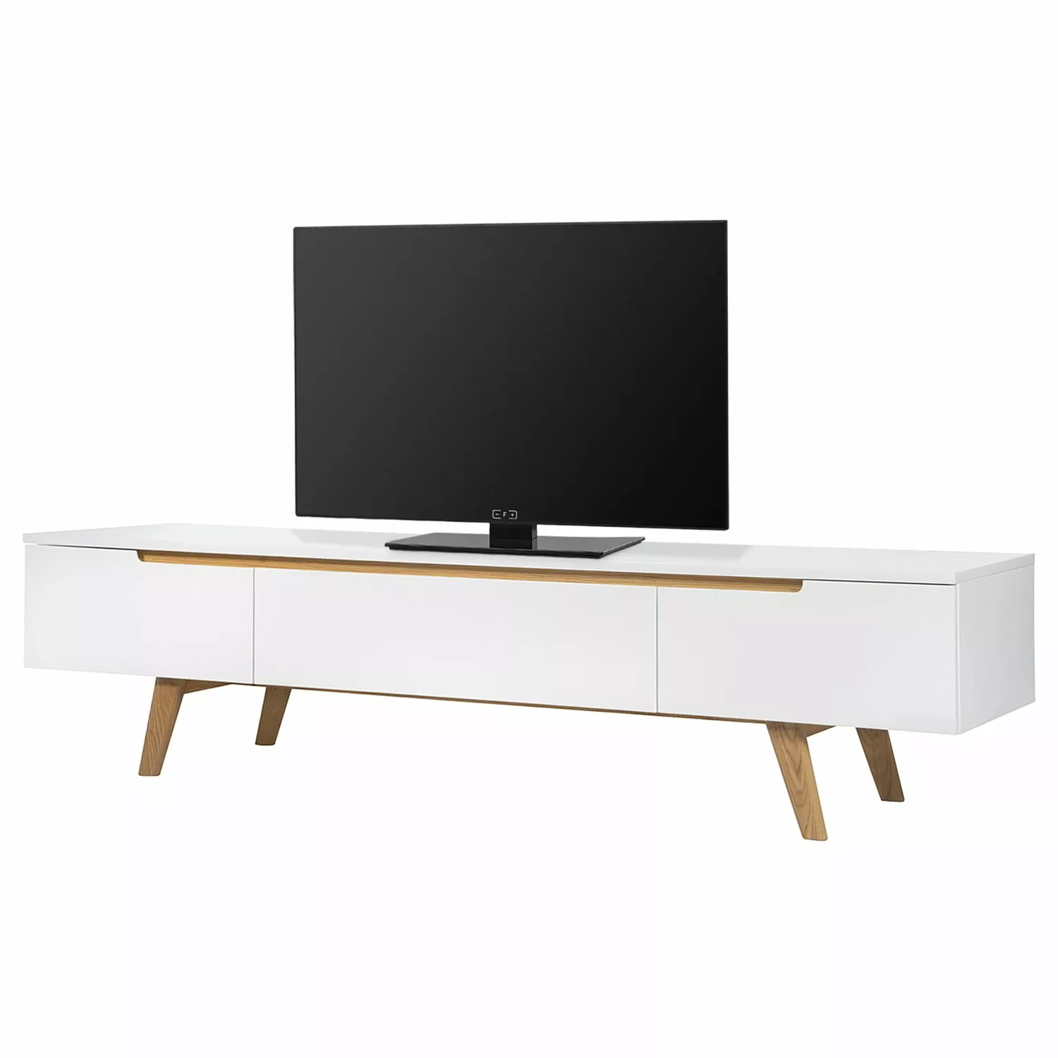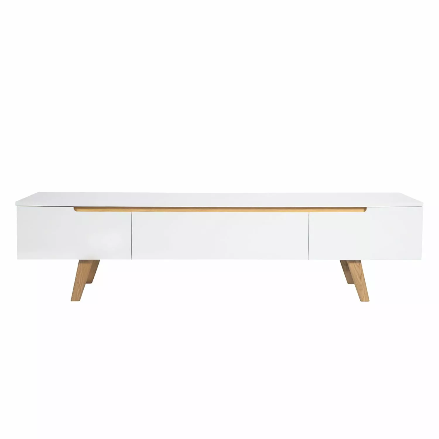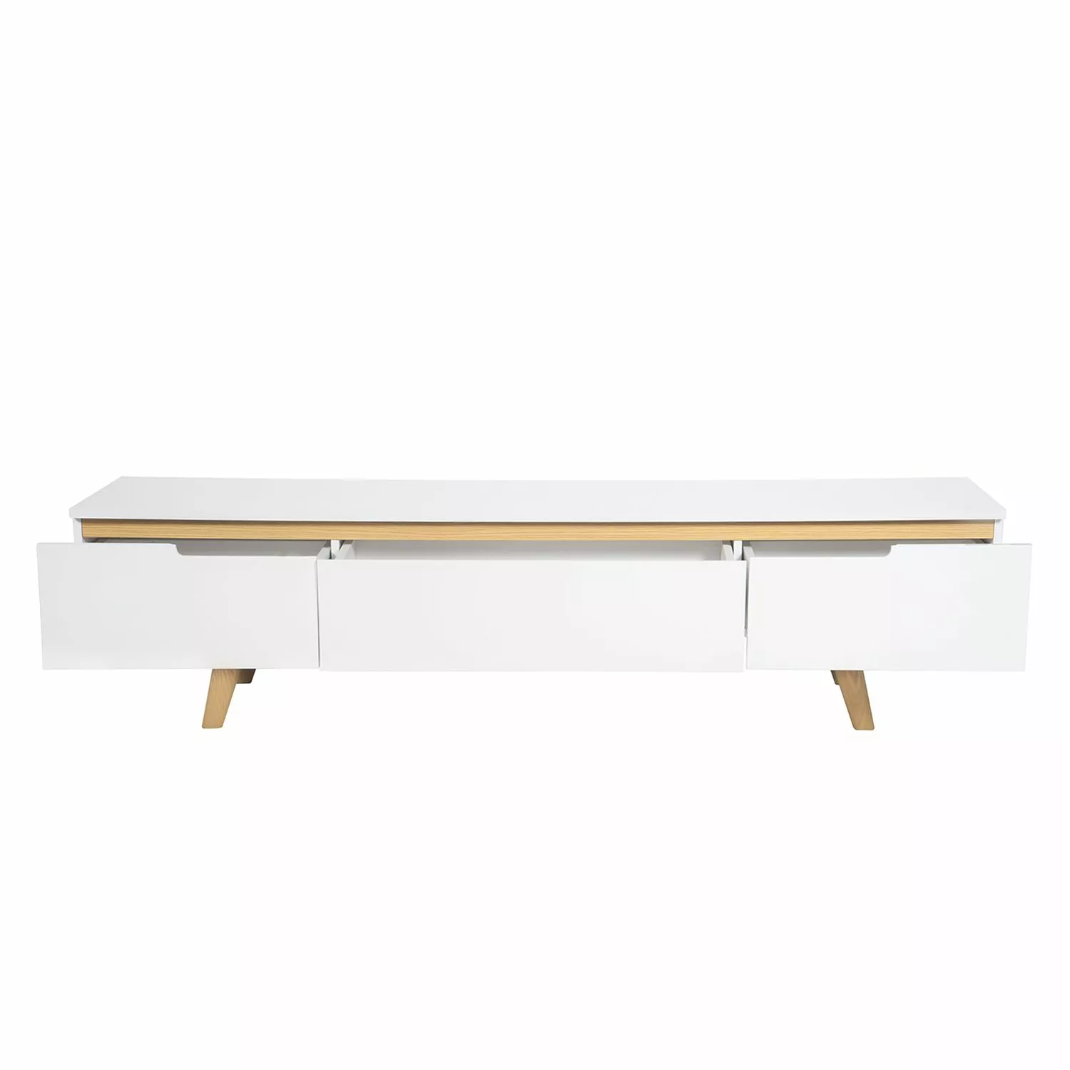 Das praktische TV-Lowboard Allium in schlanker Optik besteht teilweise aus massiver Esche und ist auf Hochglanz poliert. Dank des eleganten Möbelstücks können elektronische Geräte und andere Dinge bequem verstaut werden. Die schräg stehenden schmalen Füße aus massivem lackiertem Holz unterstreichen das edle Design im Stil der 1960er Jahre. Der Schrank fällt an jedem Platz durch seine nostalgische Erscheinung ins Auge. Um das schnörkellose Aussehen des TV-Lowboards Allium hervorzuheben, wurde auf angebaute Griffe verzichtet, wobei sich die 3 Schubladen mit Soft-Close-Funktion mit einer Eingriffleiste öffnen lassen.