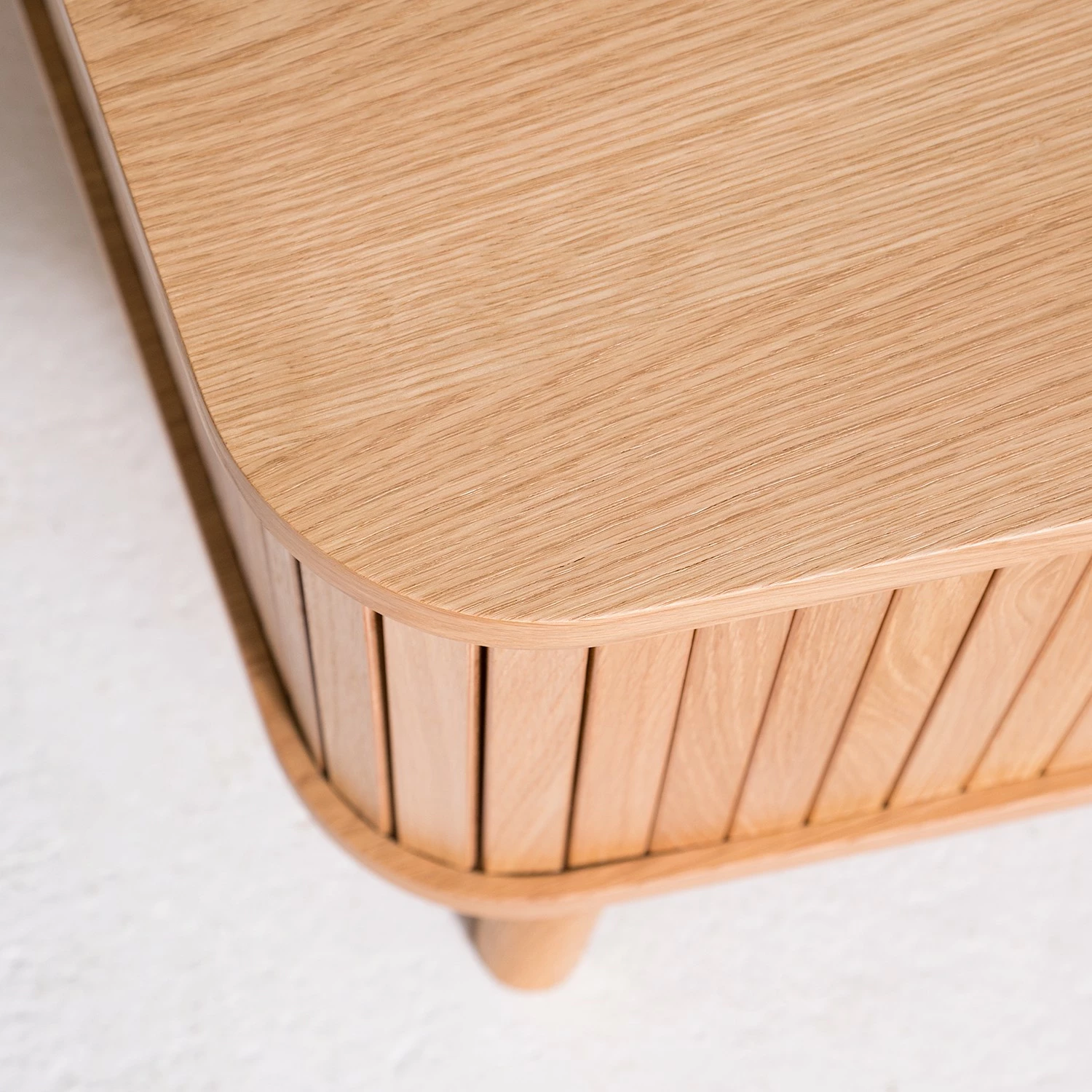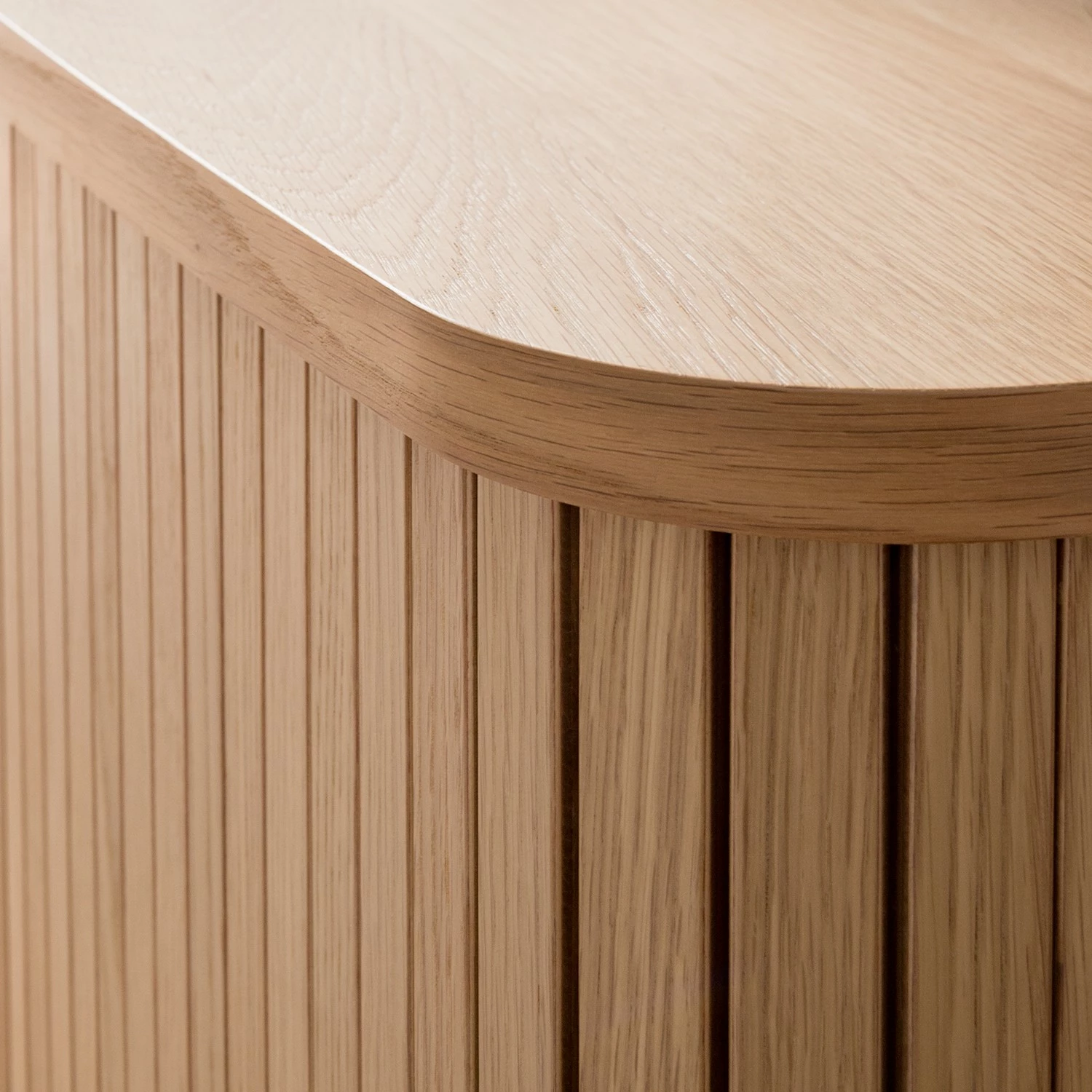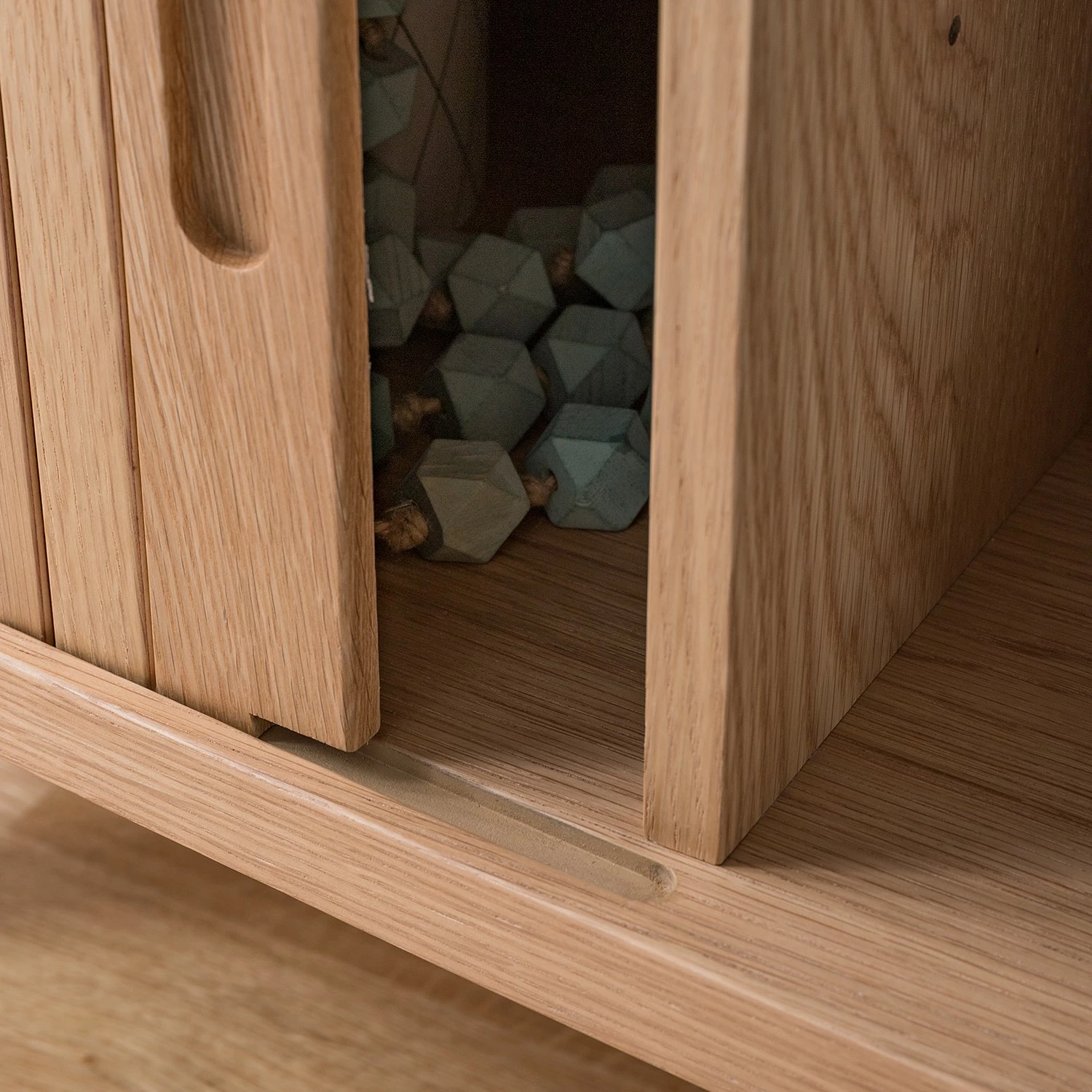 - Deckplatte & Füße: Massivholz Eiche, lackiert