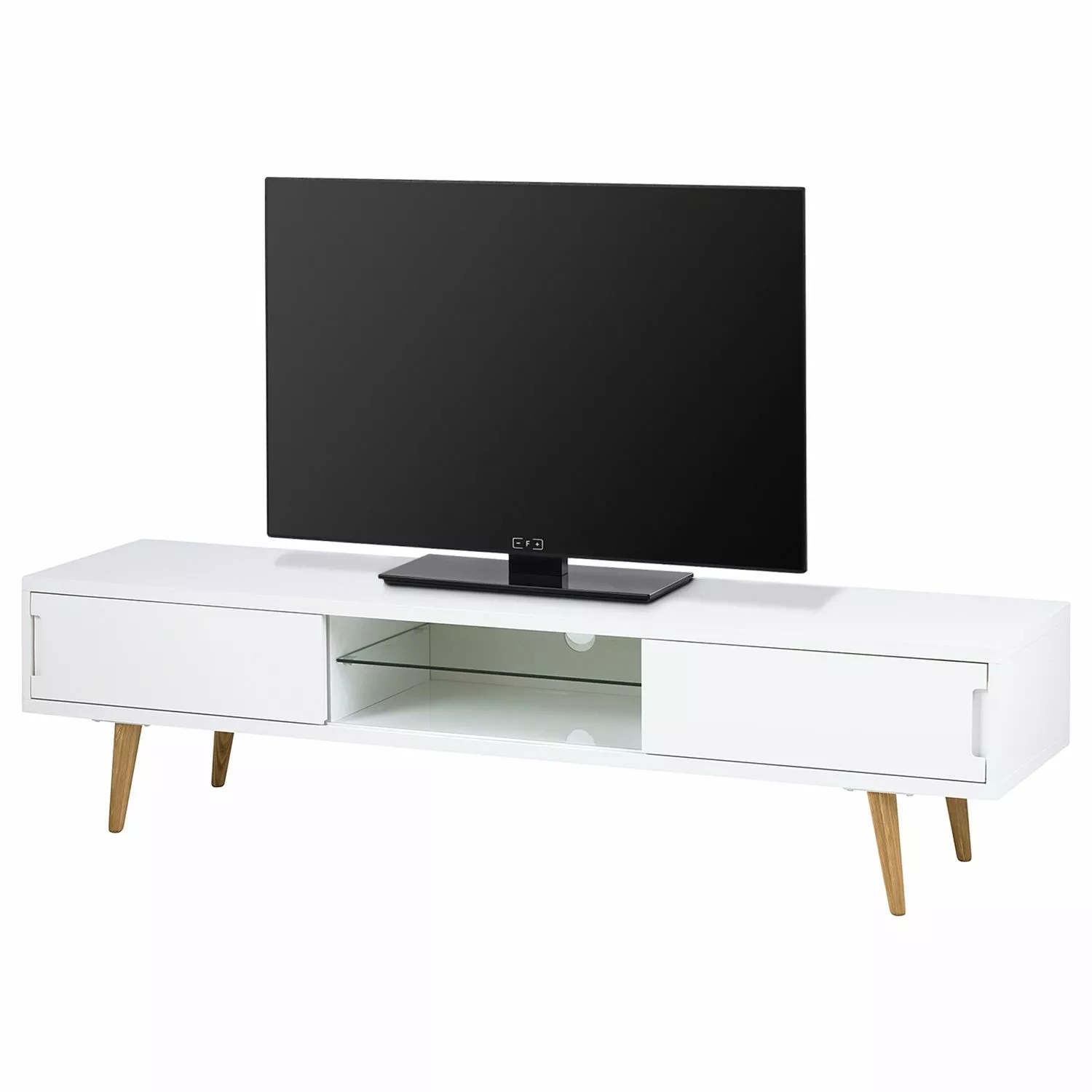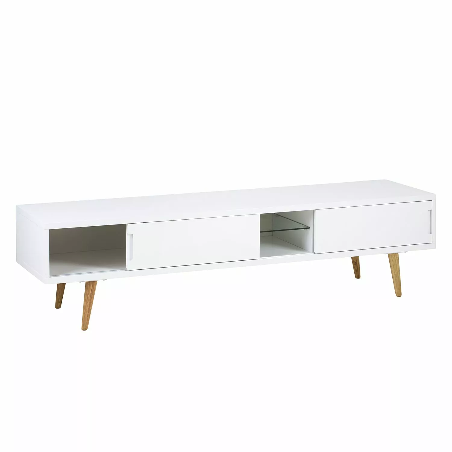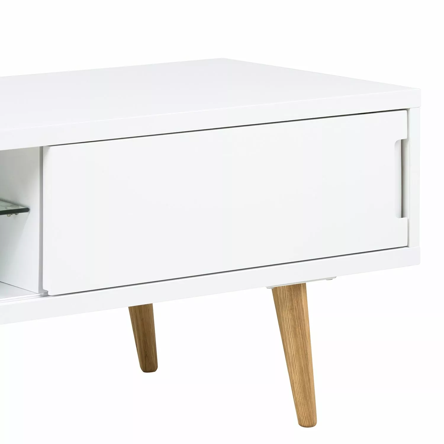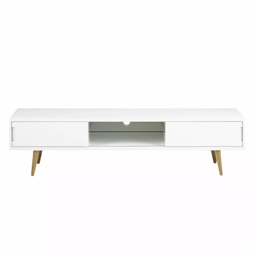 Das TV-Lowboard aus der Serie Roskilde beeindruckt mit seiner modernen geradlinigen Formgebung. Sein Korpus wurde aus weiß lackierten, mitteldichten Holzfaserplatten gefertigt. Das Gestell besteht aus pulverbeschichtetem Stahl. Eine perfekte Harmonie wird mit dem lackierten Weiß des Korpus und der leichten Maserung des massiven Eschenholzes der schlanken Beine erzeugt. So bekommt das Möbelstück ein natürliches und frisches Aussehen. Genügend Stauraum bekommt das TV-Lowboard Roskilde durch zwei Schiebetüren und ein Gerätefach, welches durch einen Glasboden geteilt ist. Ein Loch in der Rückwand ermöglicht eine praktische Handhabung der vorhandenen Gerätekabel.