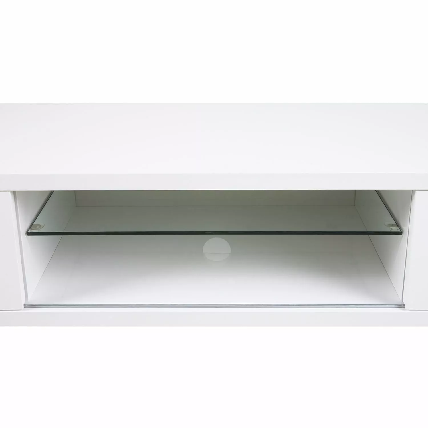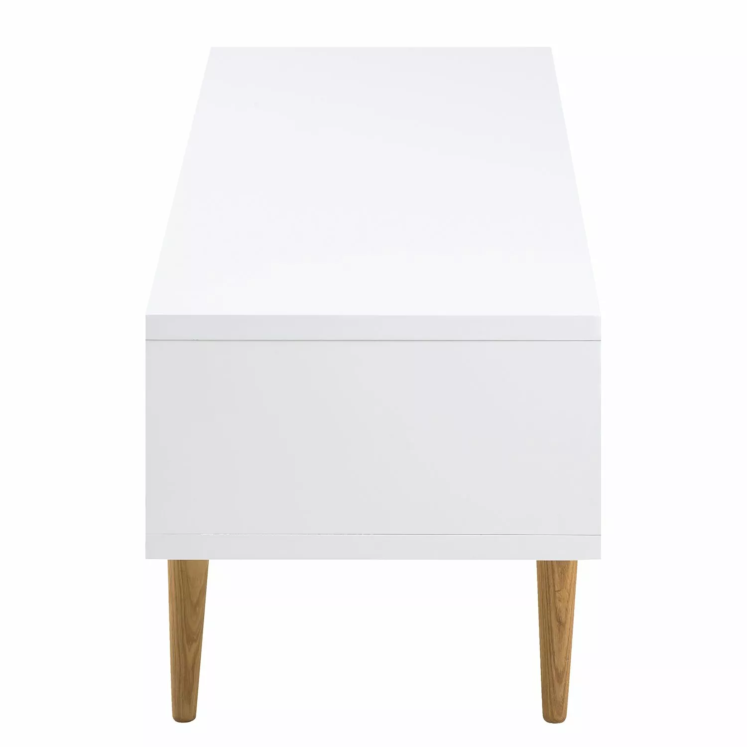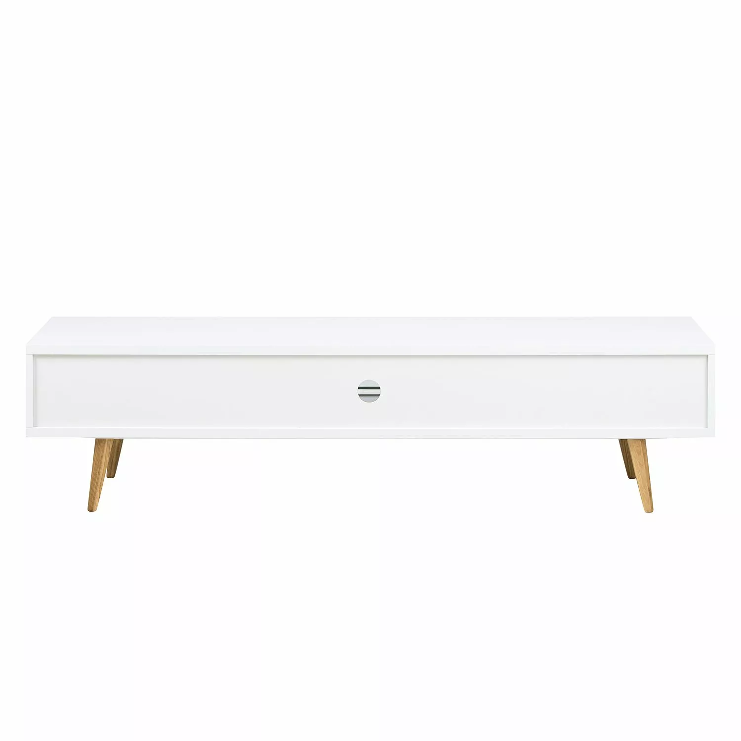 Das TV-Lowboard aus der Serie Roskilde beeindruckt mit seiner modernen geradlinigen Formgebung. Sein Korpus wurde aus weiß lackierten, mitteldichten Holzfaserplatten gefertigt. Das Gestell besteht aus pulverbeschichtetem Stahl. Eine perfekte Harmonie wird mit dem lackierten Weiß des Korpus und der leichten Maserung des massiven Eschenholzes der schlanken Beine erzeugt. So bekommt das Möbelstück ein natürliches und frisches Aussehen. Genügend Stauraum bekommt das TV-Lowboard Roskilde durch zwei Schiebetüren und ein Gerätefach, welches durch einen Glasboden geteilt ist. Ein Loch in der Rückwand ermöglicht eine praktische Handhabung der vorhandenen Gerätekabel.