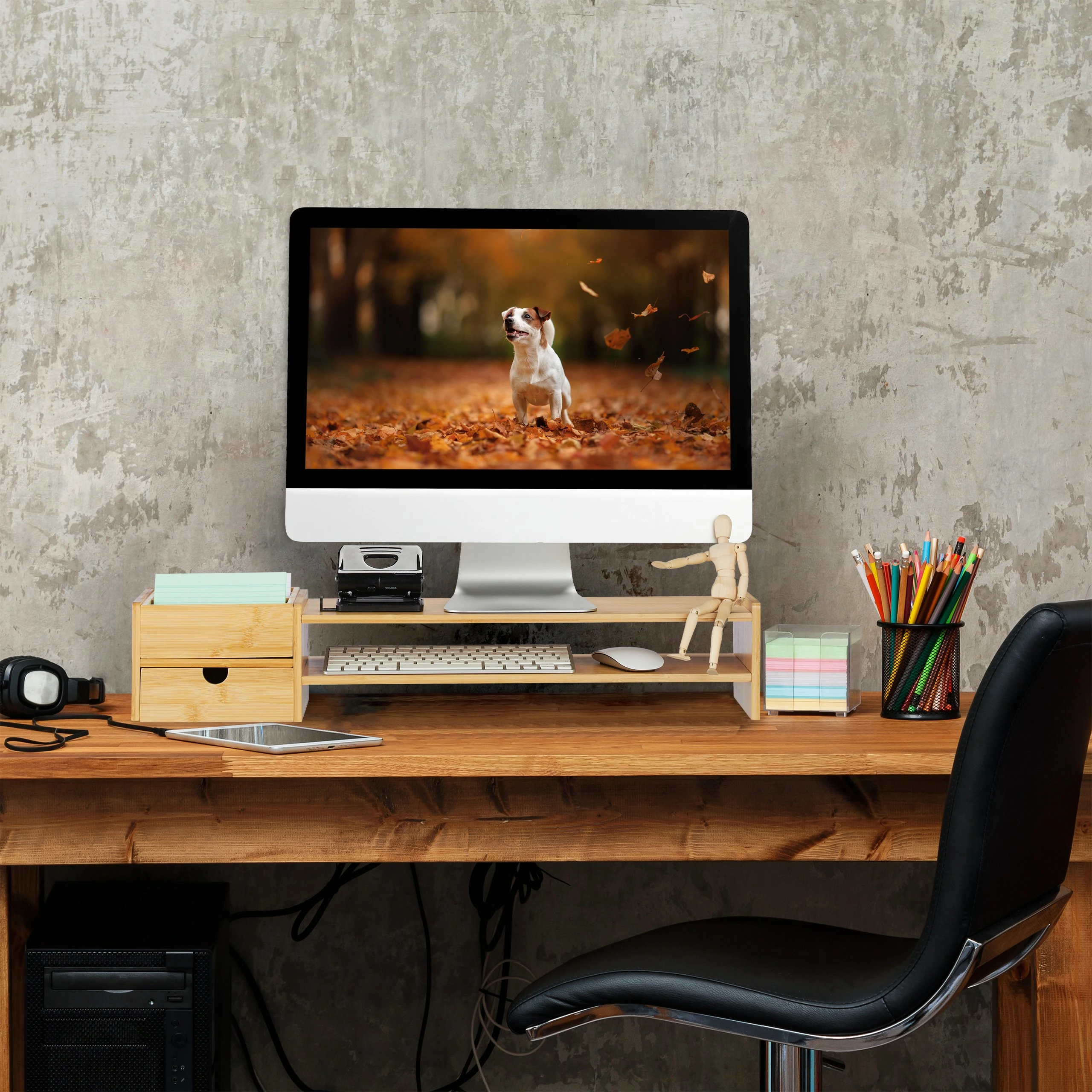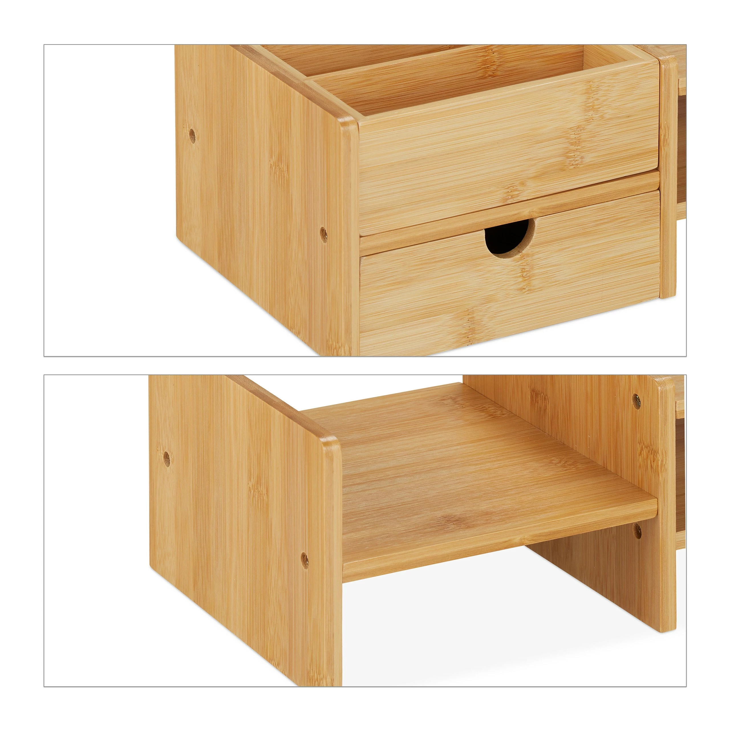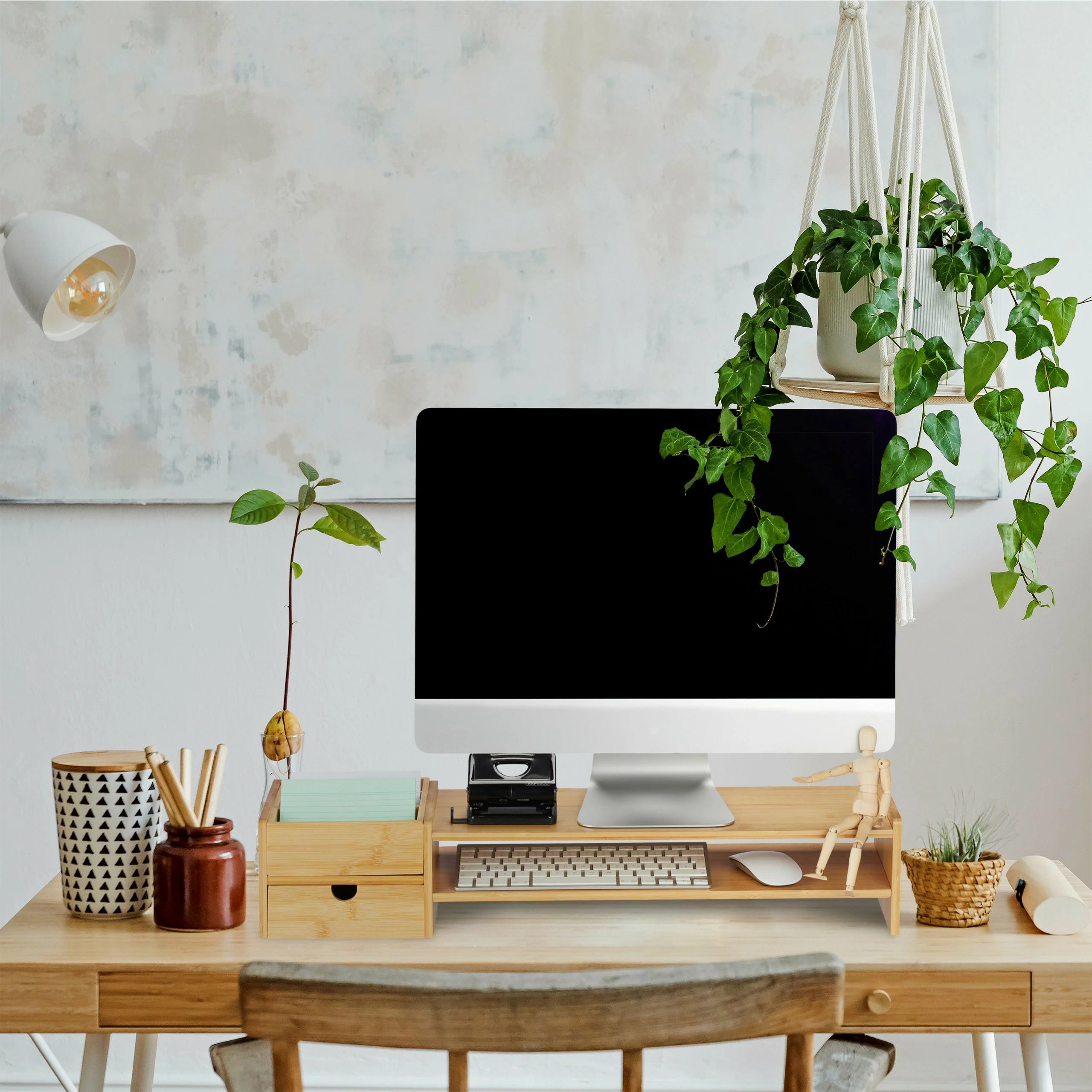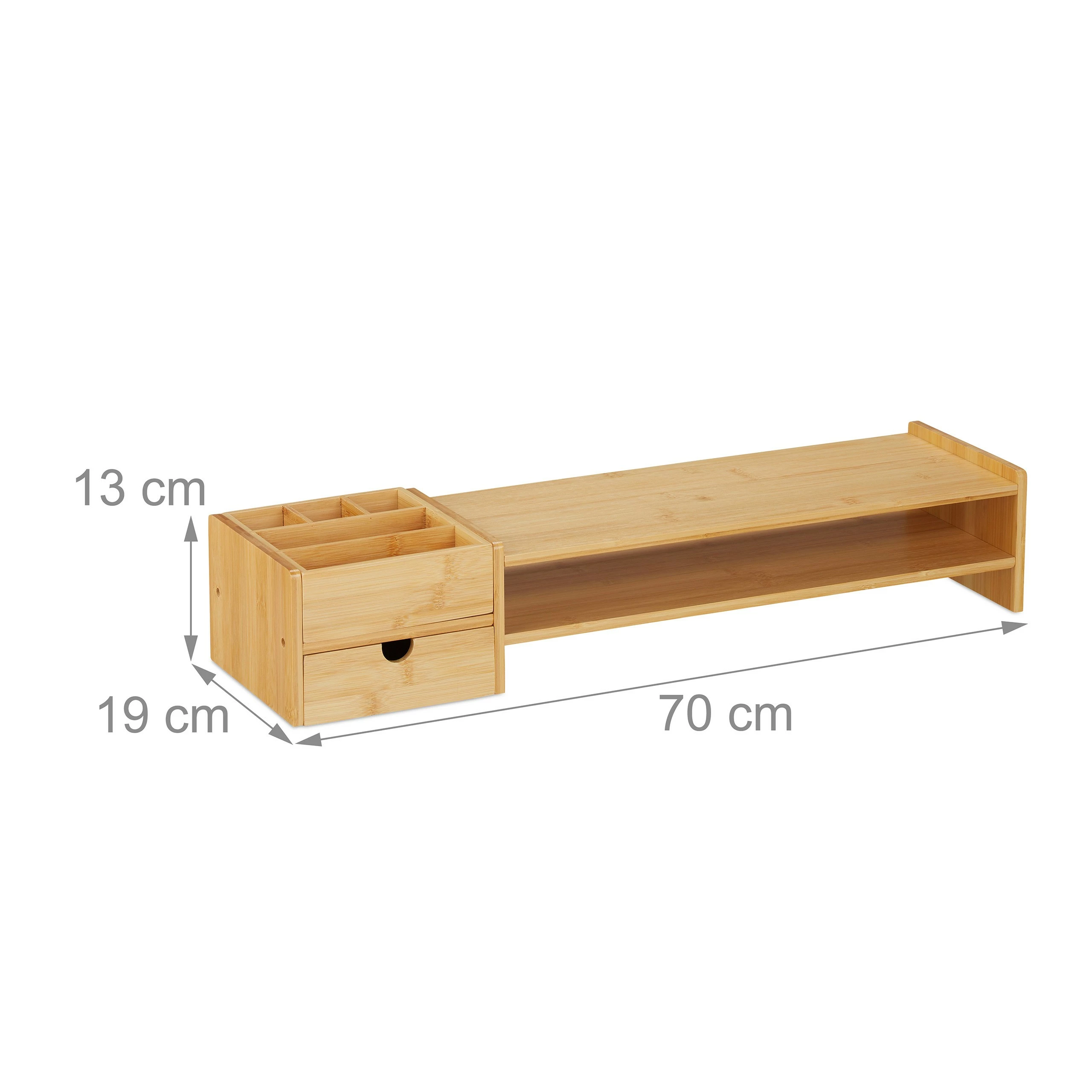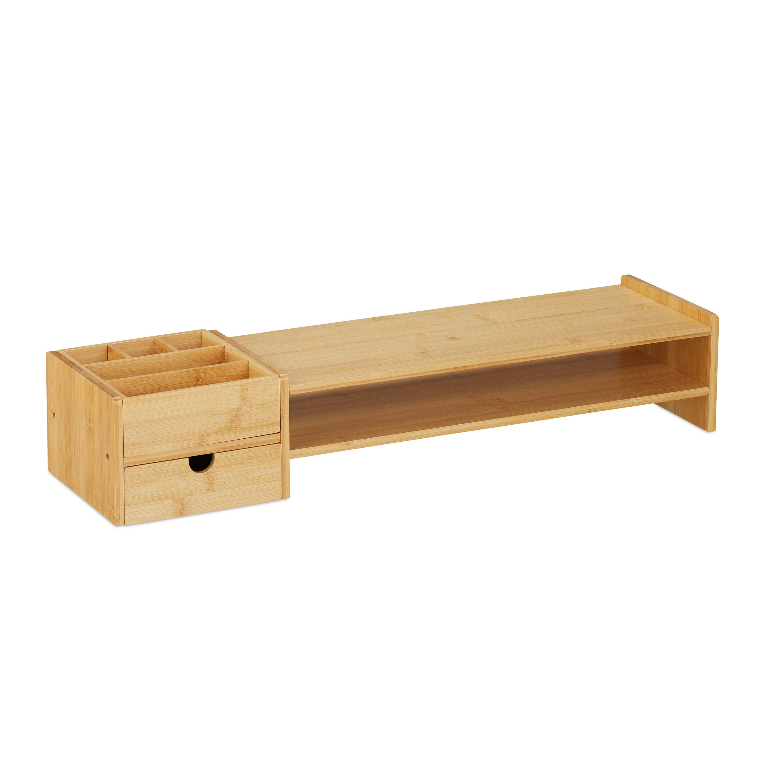 Dieser Monitorunterbau für den Schreibtisch sorgt für Ordnung am Arbeitsplatz und eine aufrechte, ergonomische Sitzhaltung. Die Monitorerhöhung aus Bambus verfügt über eine Schublade und Ablagen, die ausreichend Stauraum für Stifte, Bücher, Notizzettel und mehr bieten. In den oberen Fächern des Bildschirmständers lassen sich wichtige Büroutensilien griffbereit aufbewahren. Nach einem erfolgreichen Arbeitstag können Tastatur oder Unterlagen platzsparend unter die PC-Ablage geschoben werden.