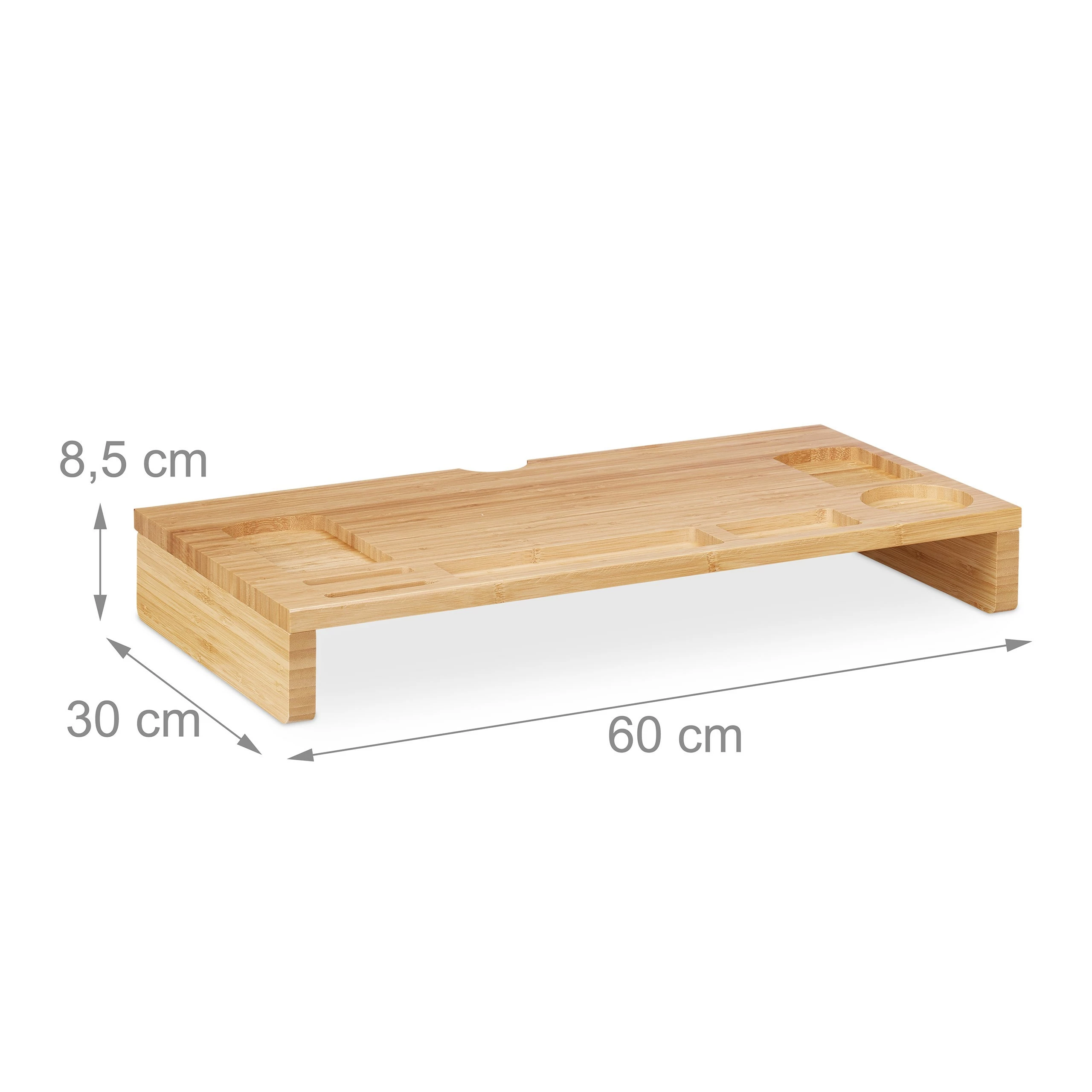 Dieser Monitorunterbau für den Schreibtisch sorgt für Ordnung am Arbeitsplatz und eine gesunde, ergonomische Sitzhaltung. Die Monitorerhöhung aus Bambus hebt den Blick und führt zu einer aufrechten Körperhaltung. In den 7 Fächern des Bildschirmständers lassen sich nützliche Büroutensilien aufbewahren oder Handy und Kaffeetasse griffbereit platzieren. Nach einem erfolgreichen Arbeitstag kannst Du Deine Tastatur einfach platzsparend unter den Monitortisch schieben.