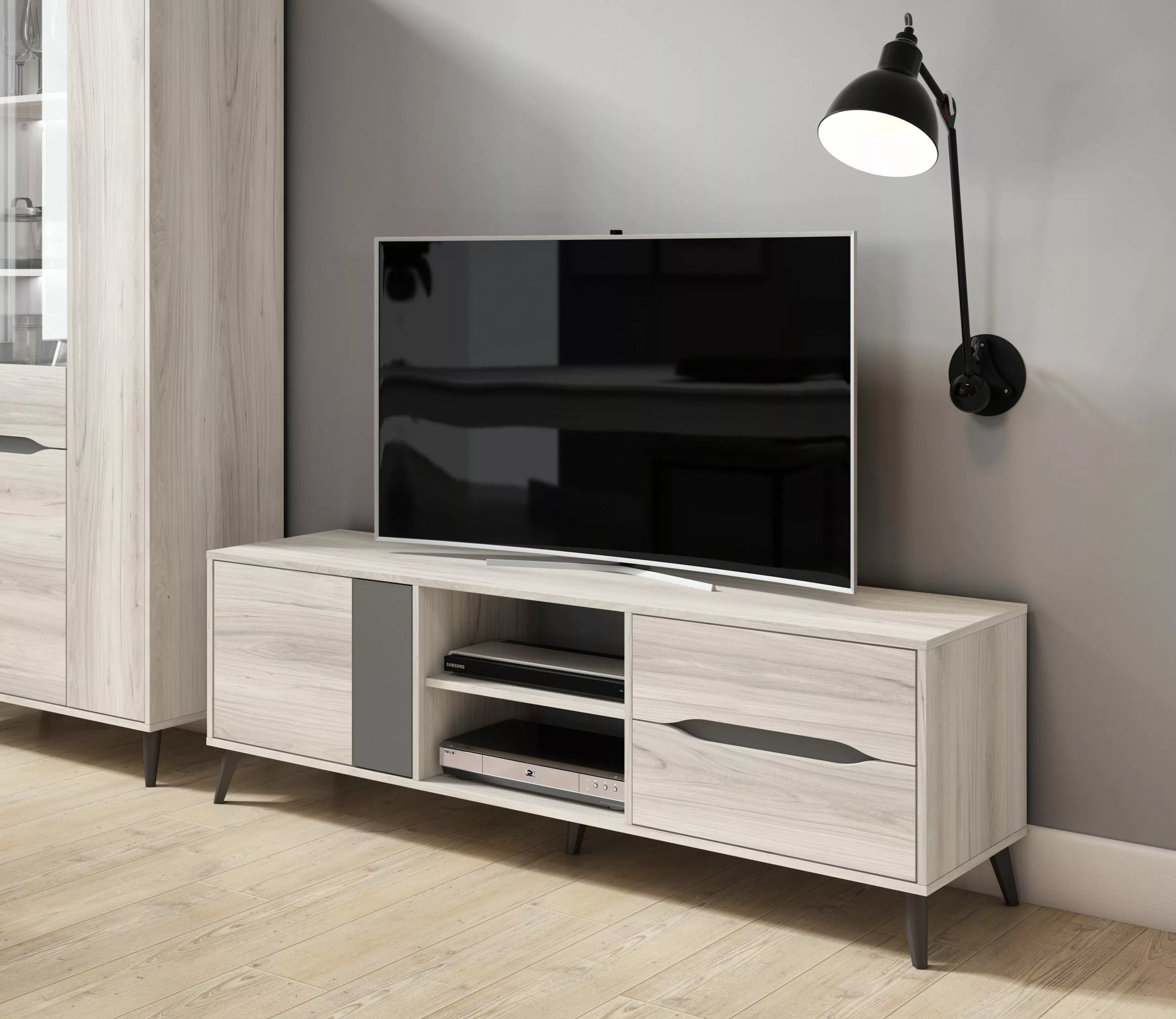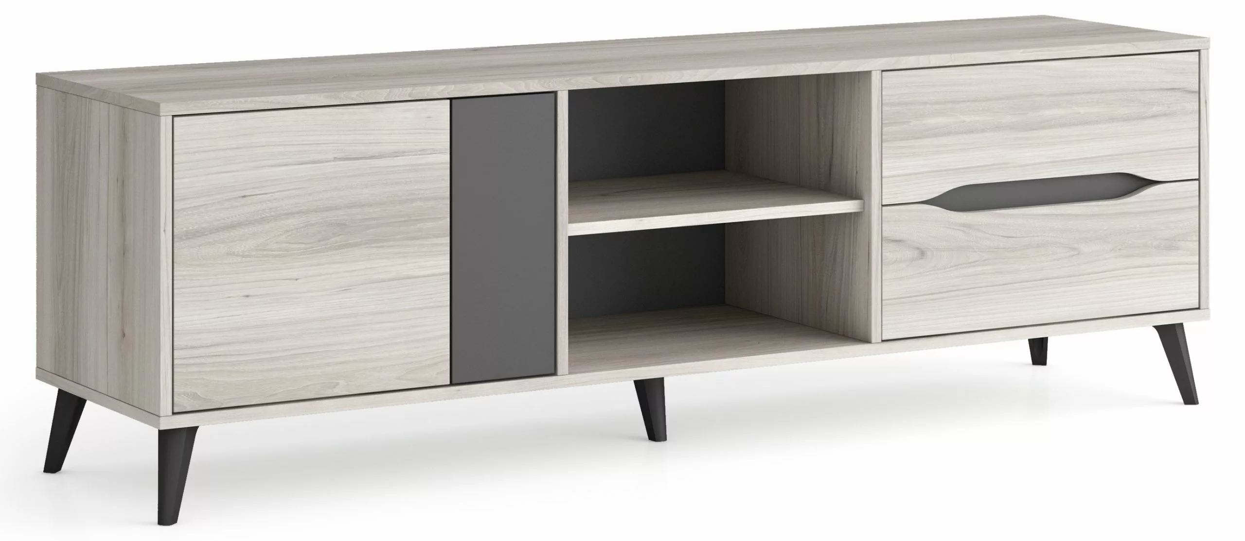 Moderne TV-Möbel mit Türen und Schubladen aus hochwertigem Melamin, Finish der Struktur in Eiche Farbe, die Türen sind Grau Farbe.