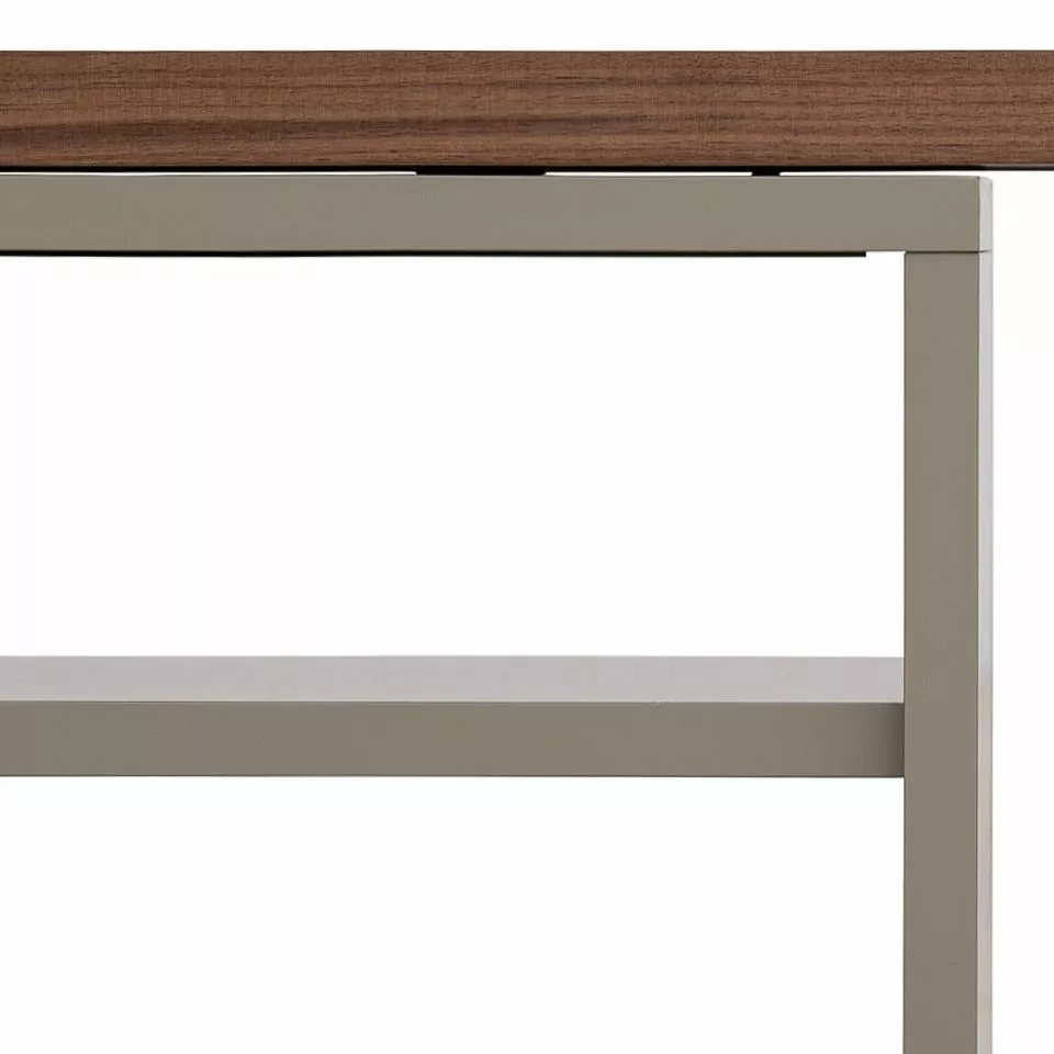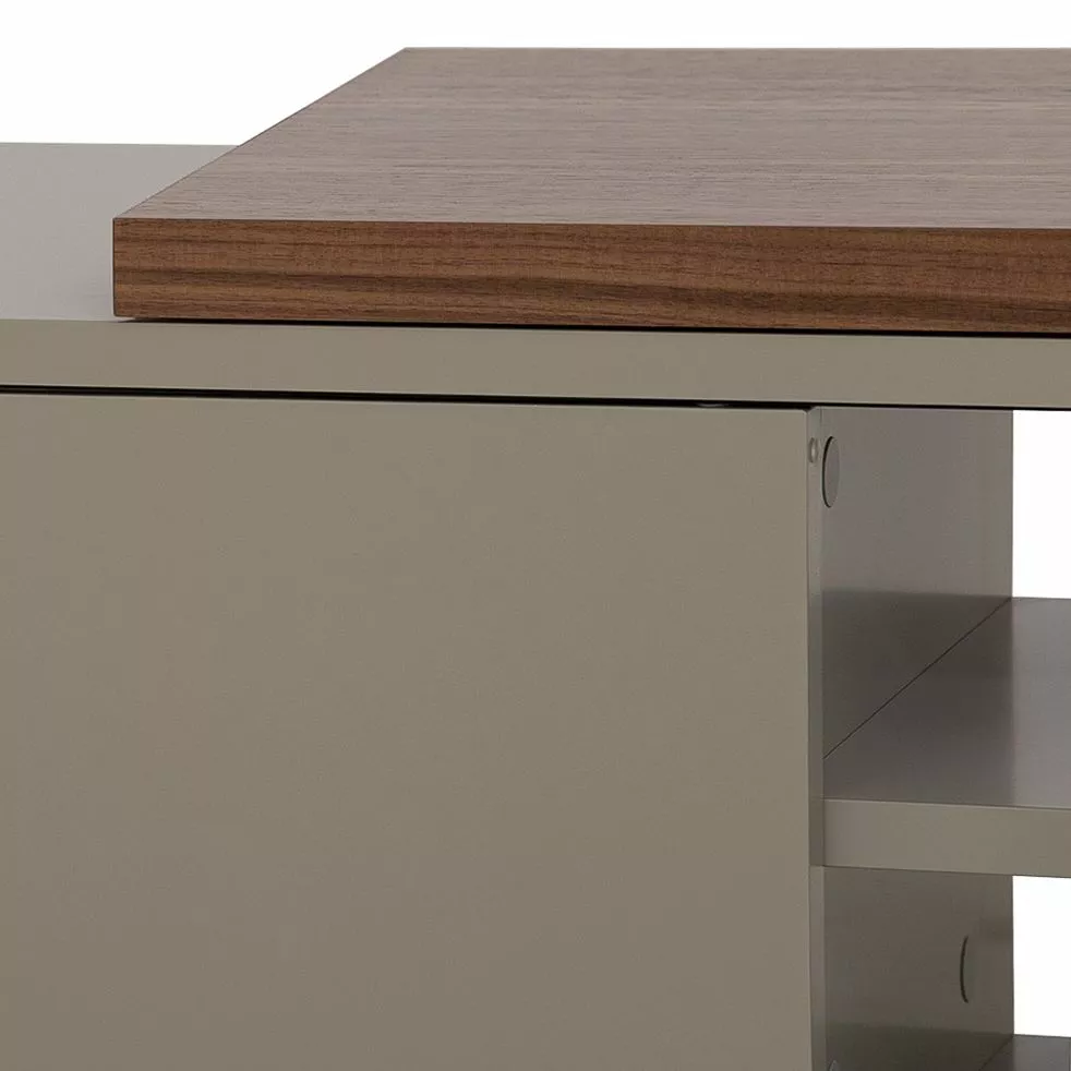 - Der obere Teil ist in Walnussfurnier gefasst und beweglich, der untere ist matt weiß lackiert und verfügt in seinem Inneren über viel Platz fürs multimediale Unterhaltungsabspielgerät.