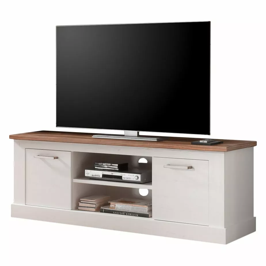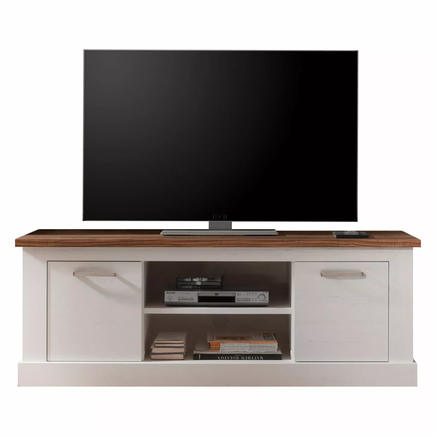 Das TV-Lowboard Inuvik ist die perfekte Ergänzung für die TV-Wand Inuvik im Wohnbereich. Mit seinem hellen, natürlichen Korpus in Pinien-Optik bietet der Schrank einen hübschen Kontrast zu dunklen Fußböden. Besonderes Highlight ist die Abstellfläche im Nussbaum-Dekor. Dank seiner klaren, geraden Linien eignet sich das TV-Lowboard Inuvik vor allem für modern eingerichtete Haushalte. Mit zwei geschlossenen Fächern und zwei offenen Stauräumen verfügt das Wohnzimmermöbel über genügend Platz für Geräte und Mediazubehör. Ein dezenter Hingucker sind hierbei die beiden silbernen Griffe an den Türen.