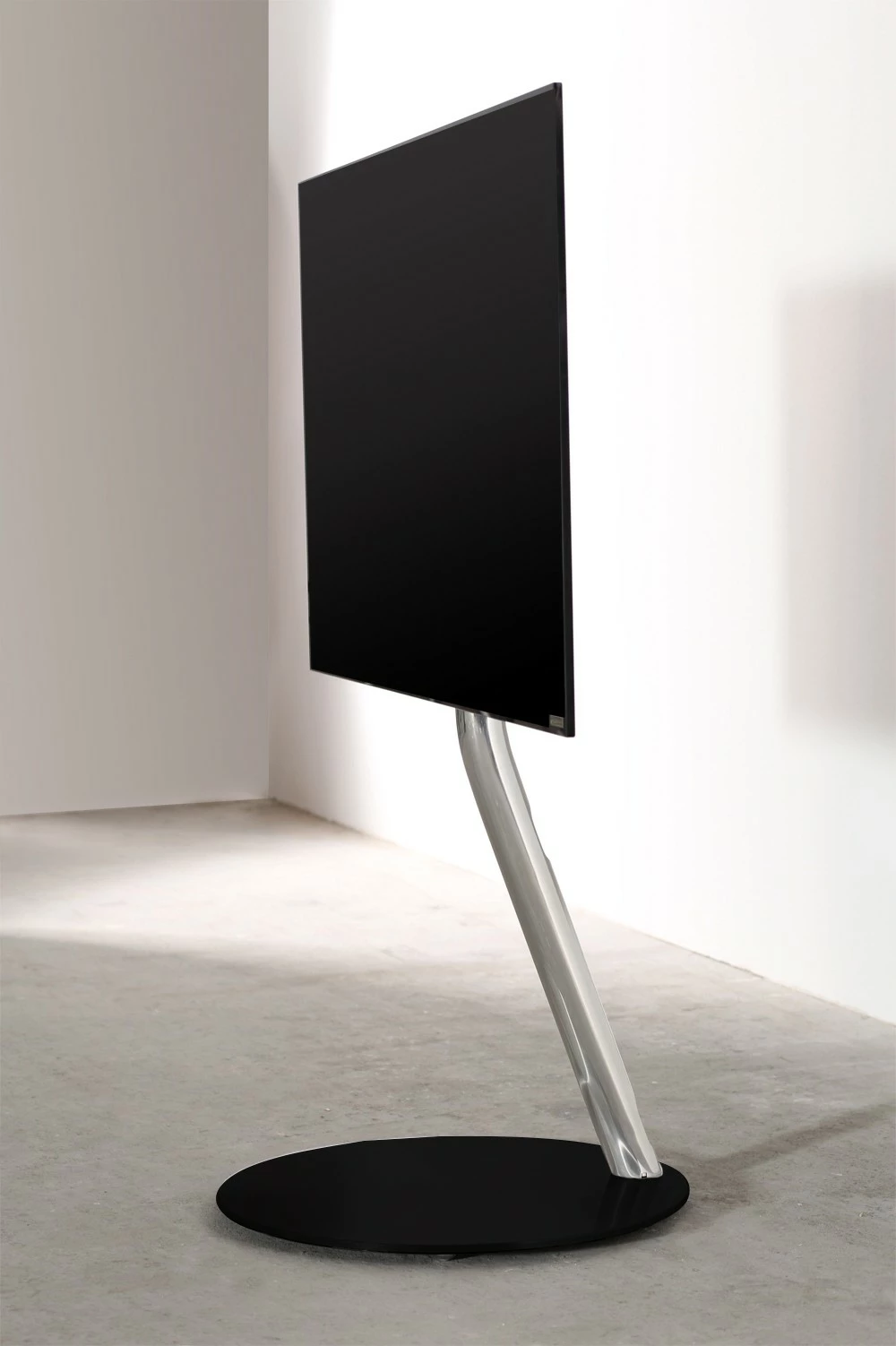 Weniger ist mehr: Minimalistischer TV-Halter als Standversion mit klarer Formensprache. Unsichtbare Kabelführung innerhalb der senkrechten Säule.