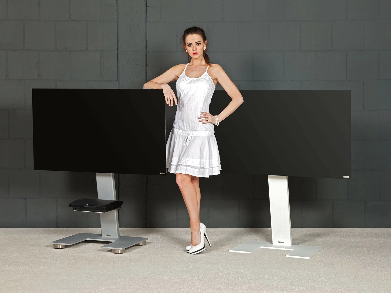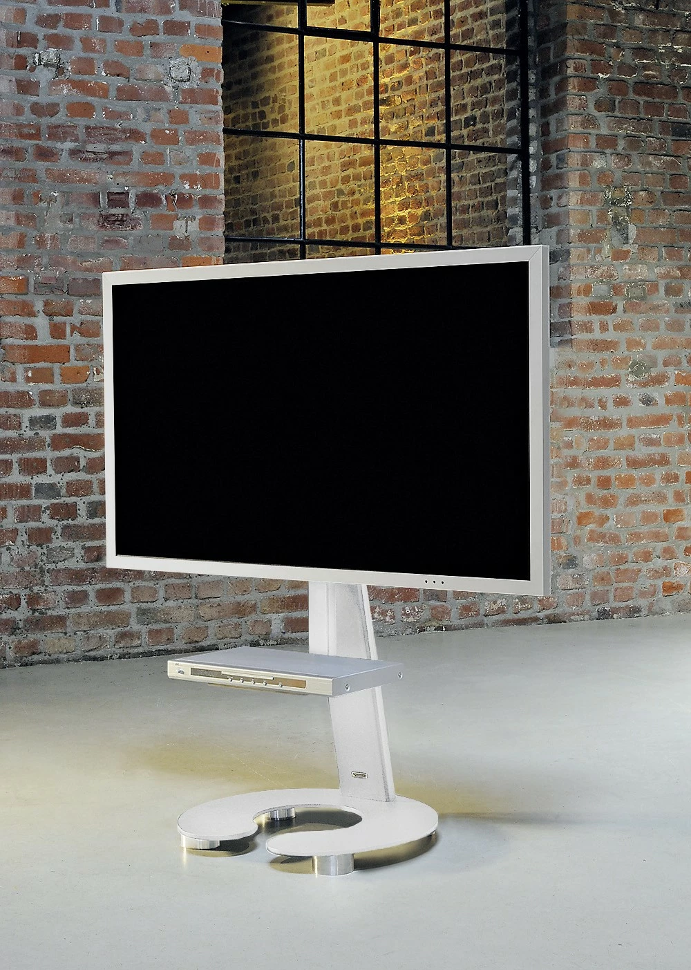 Weniger ist mehr: Minimalistischer TV-Halter als Standversion mit klarer Formensprache. Mit Edelstahlfüßen und unsichtbaren Rollen.
