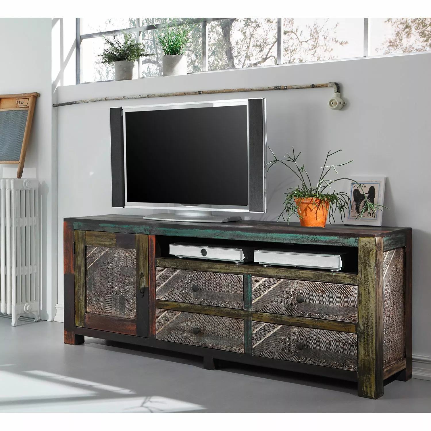 Das TV-Lowboard Goa III steht für einen extravaganten Stil, der das Flair von fernen Ländern in die eigenen vier Wände bringt – die exotische Wirkung des Wohnzimmermöbels ist unverkennbar. Erstklassig designte Seitenteile und Fronten kombiniert mit dekorativen Metallapplikationen sorgen hier für ein fesselndes Erscheinungsbild. Zur Ausstattung des Möbels gehören eine Tür sowie ein Fach für Geräte. Unter diesem Fach befinden sich vier Schubladen. Das TV-Lowboard Goa III besteht zum Teil aus lackiertem Akazien- und Mangoholz – die Absetzungen sind aus MDF gefertigt.
